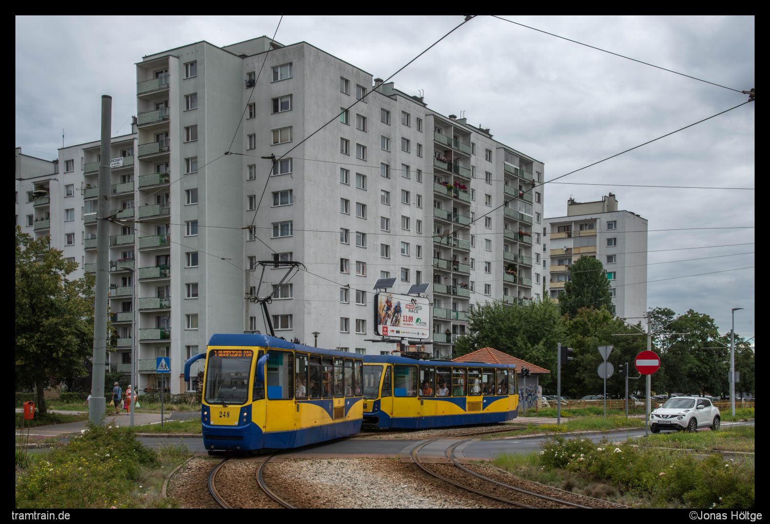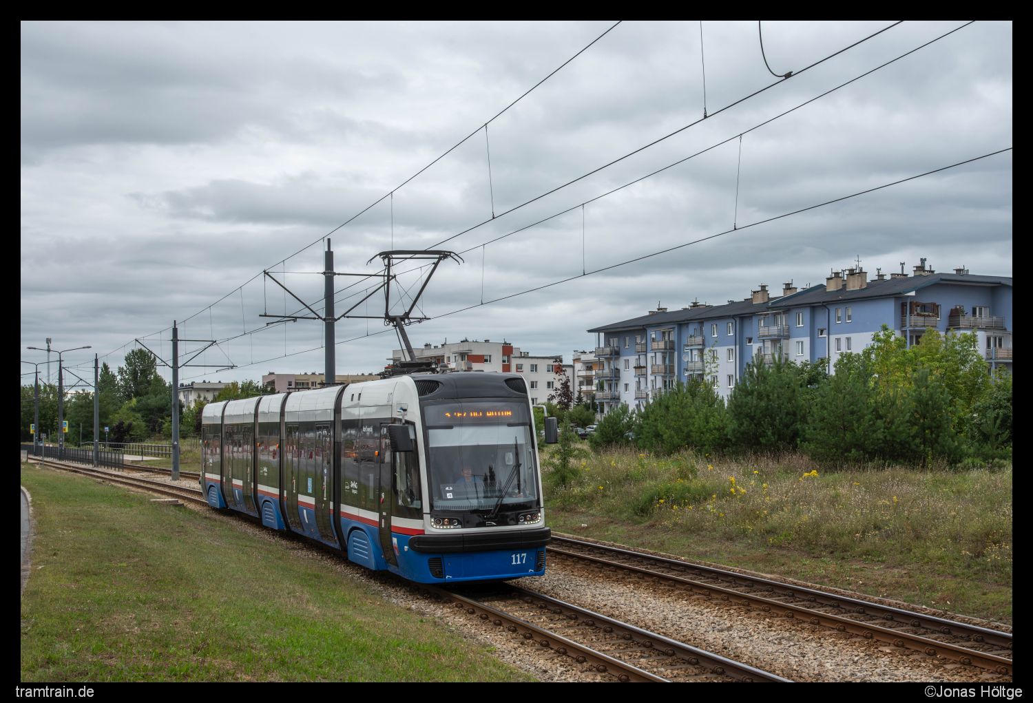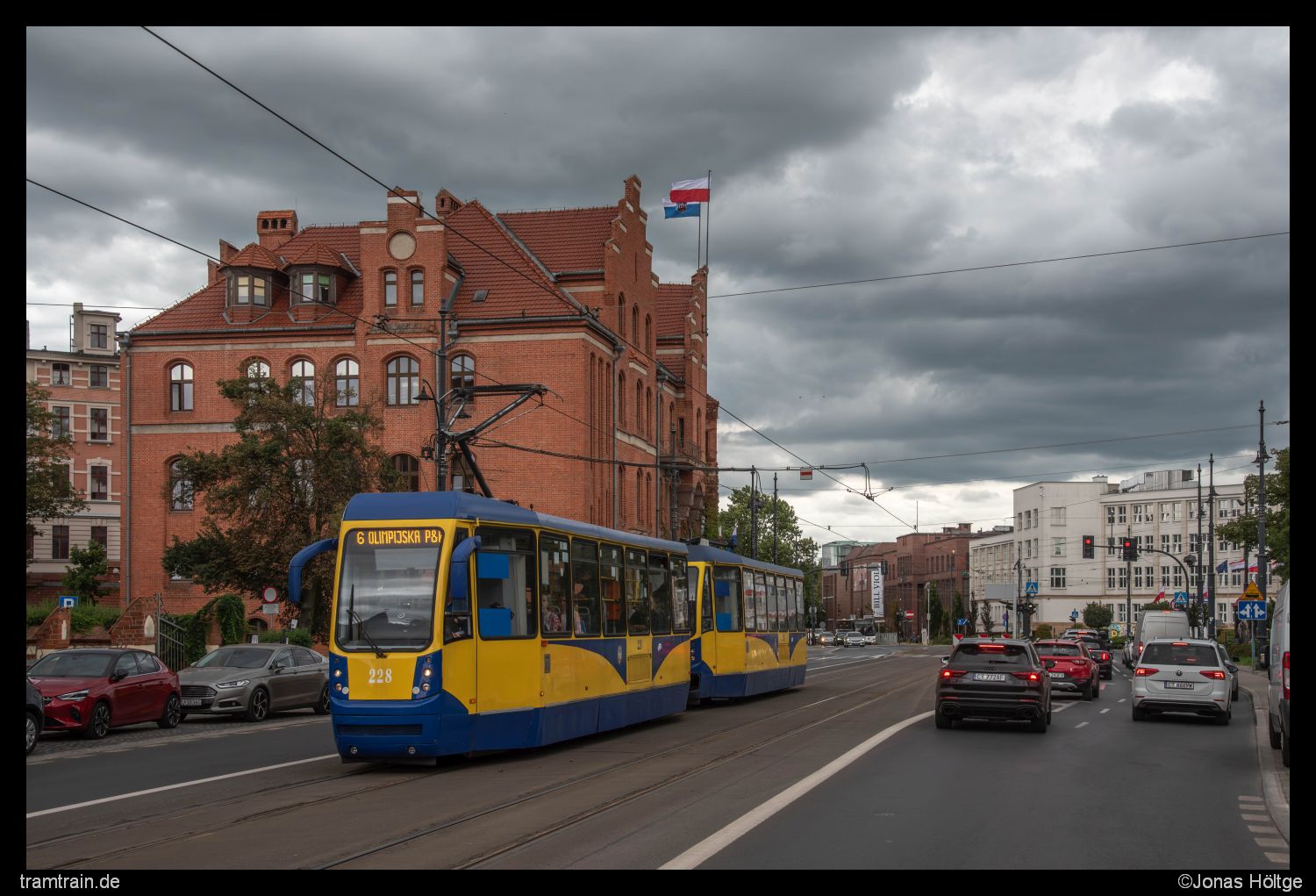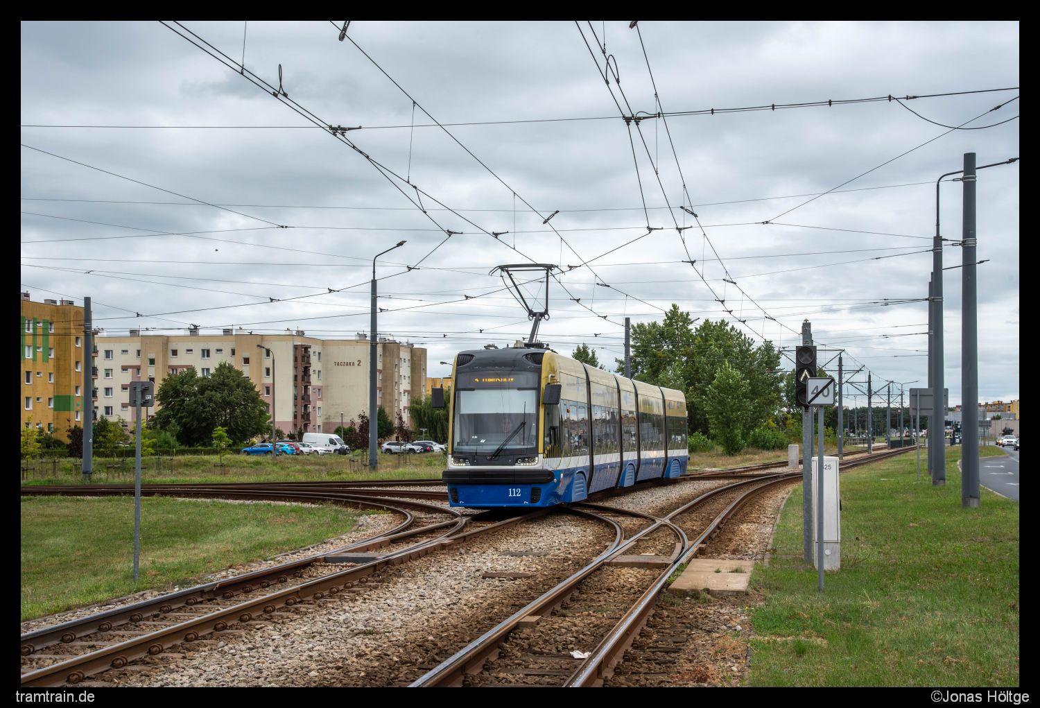 Nicht so schön war der Umstand, dass auch ich mich gleich im nächsten Wagen sitzend durch eben jene Kurve arbeiten musste. Ich hatte jetzt genug von der Strecke gesehen und wollte zurück in Richtung Innenstadt fahren. Dort gab es noch einige wenige Linien, die ich bis jetzt heute nicht gesehen hatte und somit bestand noch ein ganz kleiner Teil Resthoffnung, dass vielleicht dort noch Altwagen angetroffen werden konnten. Also setzte ich mich in die nächste Bahn, die von der Zwischenendschleife abfahren sollte und es ging die lange Strecke eine gefühlte Ewigkeit lang zurück. Eine letzte Strecke hatte ich für heute noch auf dem Zettel stehen. Eigentlich wollte ich die Innenstadtdurchfahrt bereits gestern abarbeiten. Als dort die Sonne richtig gestanden hätte, war aber gerade ein Wolkenfeld durchgezogen, sodass dort keine Sonnenbilder möglich gewesen wären. Heute war die Chance auf Sonne gar nicht erst gegeben, dafür war auch der Himmel ein ganzes Stück dunkler, sodass ich mich jetzt nochmal an die Innenstadtdurchfahrt machen wollte. Also ging es bis zur Station Plac Praw Kobiet. Von dortaus bewegte ich mich zu Fuß bis zur Station Gdańska/Chodkiewicza und wieder zurück. Zwar ohne Sonne, dafür aber mit interessanten Wolkenkonstellationen und bei durchaus dichtem Verkehr entstanden so innerhalb von knapp einer Stunde einige Bilder an dem kurzen Stück.