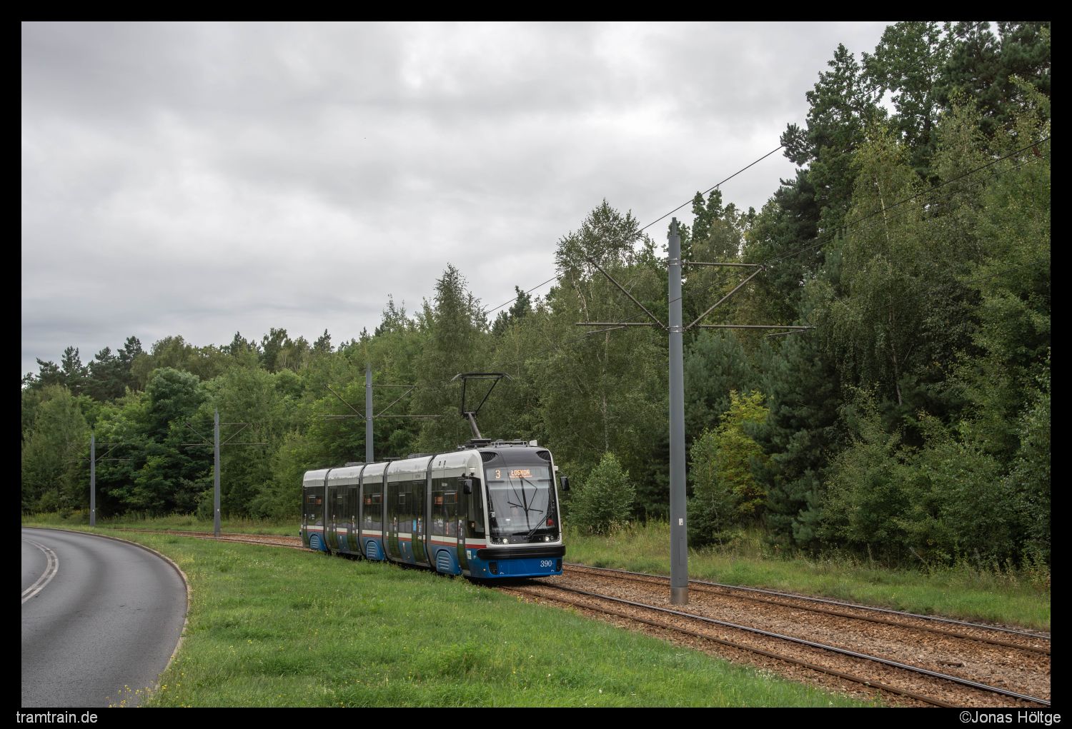 Nur wenig später folgte Wagen 390 als Linie 3. Bei den vielen Linien wurde hier fast ein 5-Minuten-Takt gefahren. Ich hatte mich einige Meter weiter verschoben und war so in einer kleinen Kurve angelangt. So idyllisch wie das letzte Bild vielleicht vermuten ließ, war es hier in Wirklichkeit nicht. Auf der links zu sehenden Straße donnerten regelmäßig LKWs entlang, um in das nahe gelegene Industriegebiet zu gelangen.
