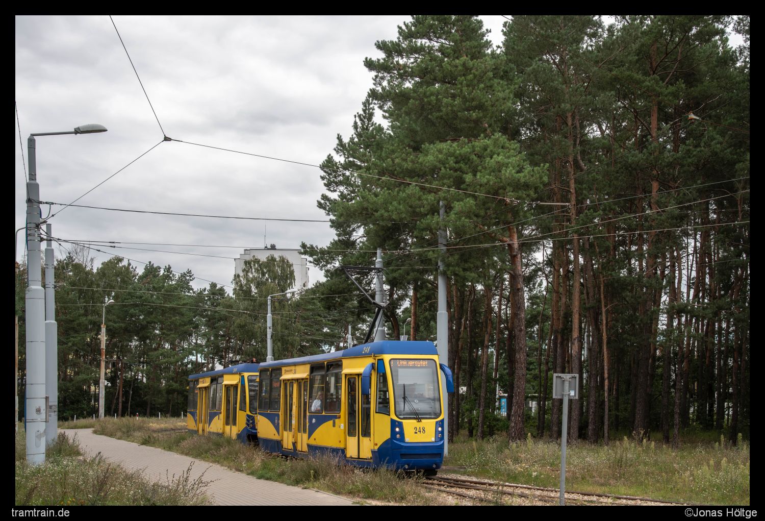 Inzwischen befand ich mich eine Haltestelle weiter an der Station Akademicka/Rejewskiego. Ohne Sonne wirkte die Strecke, die hier durch viel Grün führte, leider ein wenig nichtssagend. Gegen das Wetter konnte ich jedoch nichts machen und da es auch keine Aussicht auf Besserung gab, nahm ich es so hin wie es war. Ich war von der Haltestelle ein Stück zurückgelaufen und lichtete Wagen 397 auf dem Waldstück zwischen den beiden Stationen ab.