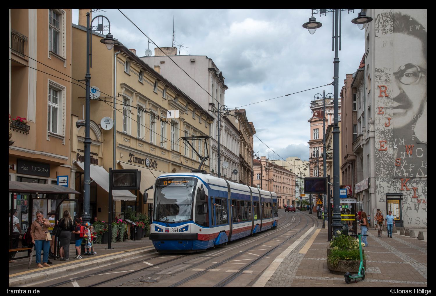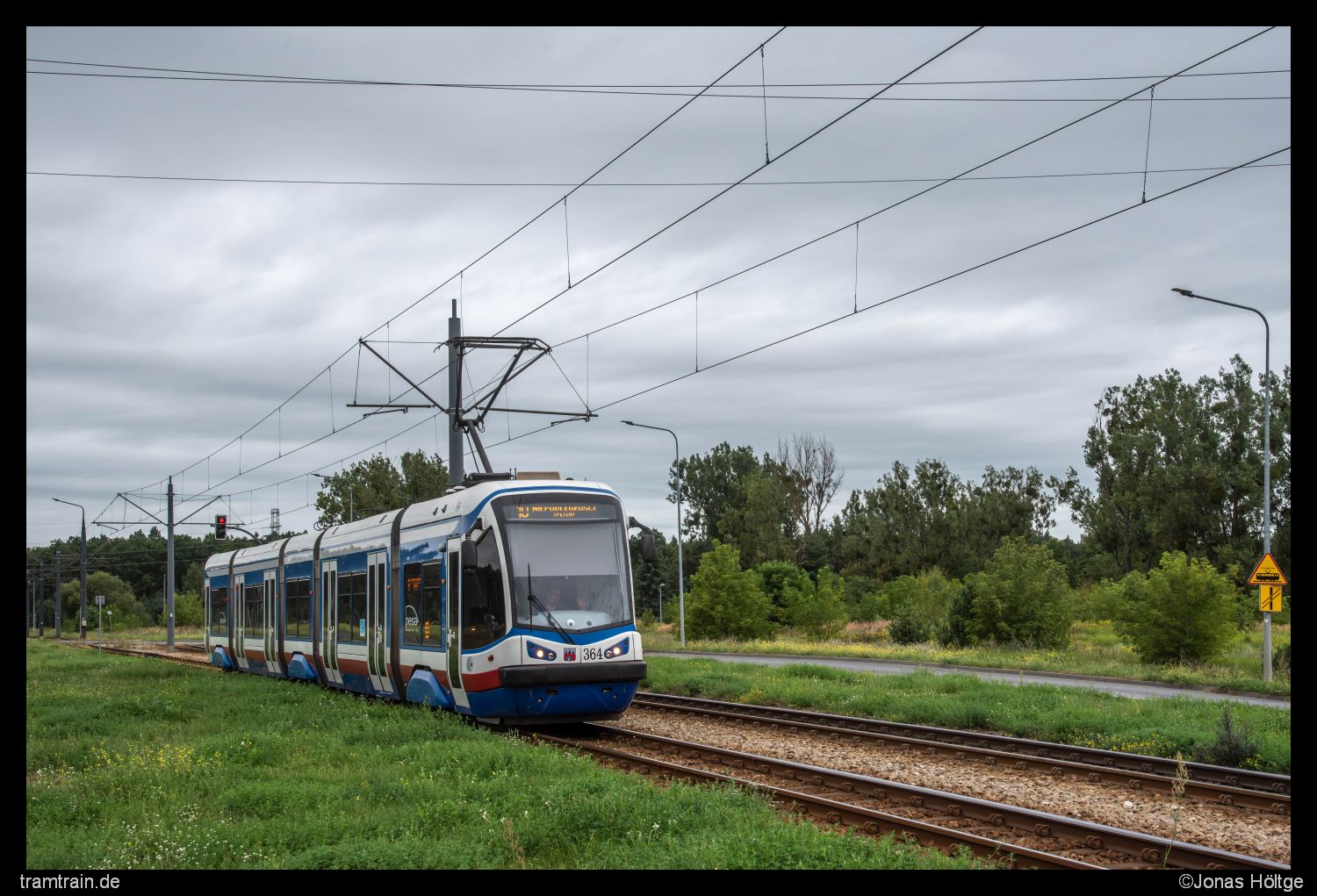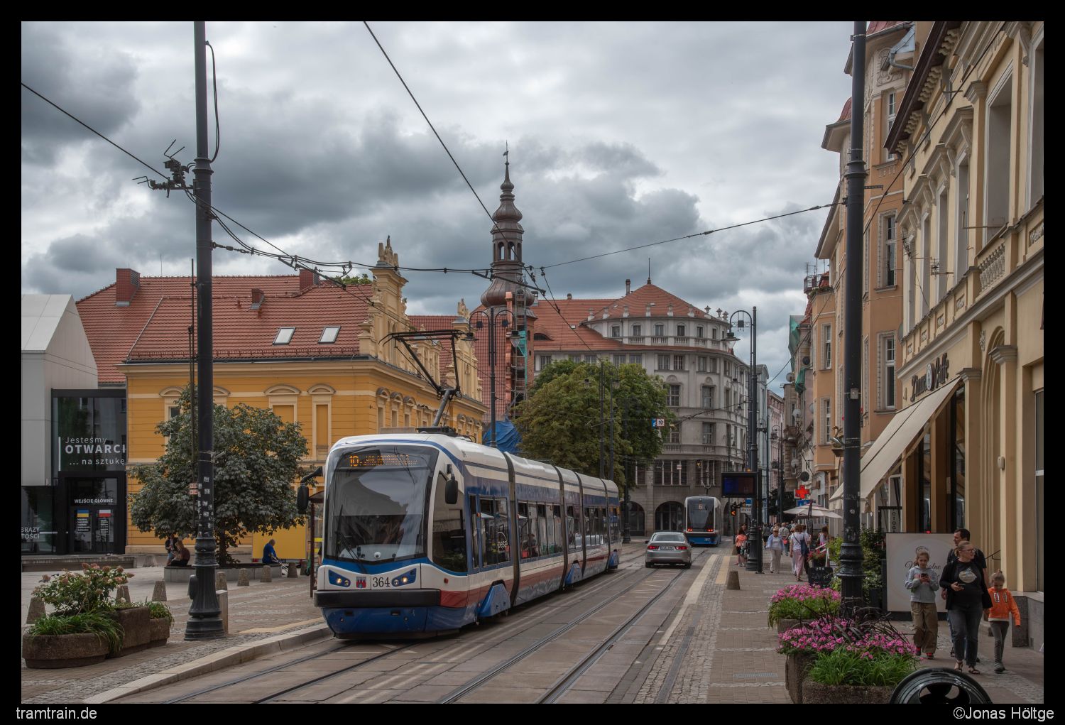 Eigentlich war ich jetzt hier durch mit dem Betrieb. Es schienen heute keine Altwagen zu fahren und das Wetter lud auch nicht gerade zu einer intensiveren Erkundung des Streckennetzes ein. Ich hatte bei dem monotonen Wagenpark auch ehrlich gesagt nicht mehr so wirklich viel Lust mich noch weiter mit dem Betrieb zu beschäftigen. Also sollte es von hier aus zurück zum Hotel gehen, wo mein Auto stand und ich würde das Weite in Richtung Thorn suchen. Dann kam mir aber doch noch ein letzter Einfall. Wenn der Wagen 364 gerade in die Richtung entschwunden war, sollte es auch nicht allzu lange dauern, bis dieser wieder zurückkommen würde. Das könnte ich nutzen, um zumindest noch ein weiteres Bild zu schießen. Da das aber sicherlich noch eine gute halbe Stunde dauern würde, ging ich zu Fuß zur Station Plac Teatralny rüber. Dort wollte ich die Perspektive umsetzen, die mir gestern Mittag aufgrund der Wolkenfront nicht geglückt war. Das Bild war natürlich schnell umgesetzt und so setzte ich mich in der Folge einfach auf eine Bank und wartete die halbe Stunde noch ab. Bei dem Wetter würde mir in Thorn sowieso erstmal nichts weglaufen und so hatte ich überhaupt keinen Stress hier schnell weg zu kommen. Kurz bevor der Wagen zurückkam, begab ich mich wieder zur Station Plac Praw Kobiet und lichtete den Wagen erneut ab.