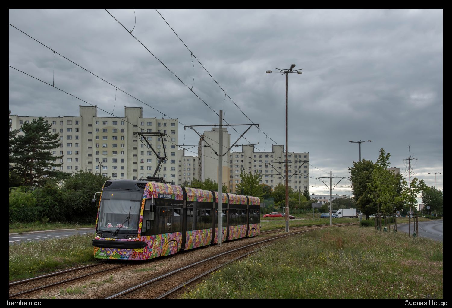 Bei Wagen 303 handelte es sich um einen besonders farbenfrohen Vertreter seiner Baureihe und um das einzige Fahrzeug mit abweichender Lackierung. Das Fahrzeug begegnete mir bei einem kleinen Zwischenstopp an der Station Ligi Polskiej. Auch hier wurde die Umgebung von jeder Menge Beton geprägt.