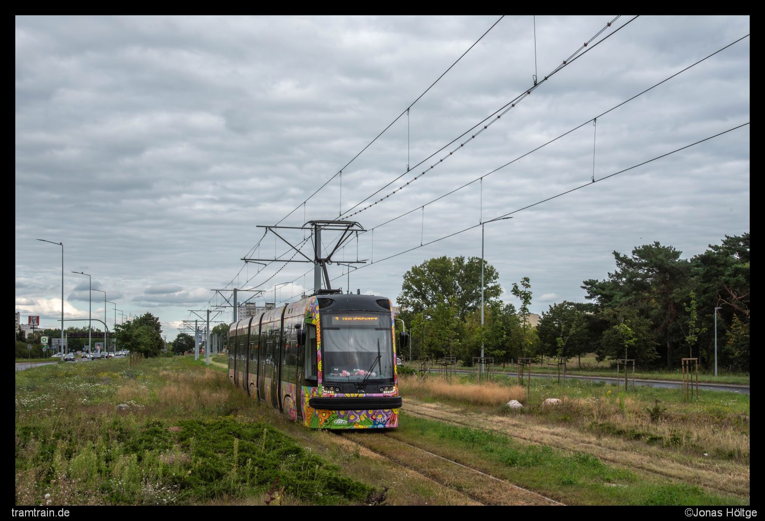 Zufälligerweise war es bei meinem nächsten Zwischenstopp wieder Wagen 303 der als nächstes Fahrzeug von der Endstation zurückkehrte. Hier wurde gut der Charakter des Linienastes deutlich. Auf einem mal mehr mal weniger breiten Mittelstreifen ging es meist gerade entlang einer vierspurigen Straße in die Platte hinaus. Wirklich fotogen gestaltete sich das Ganze nicht.