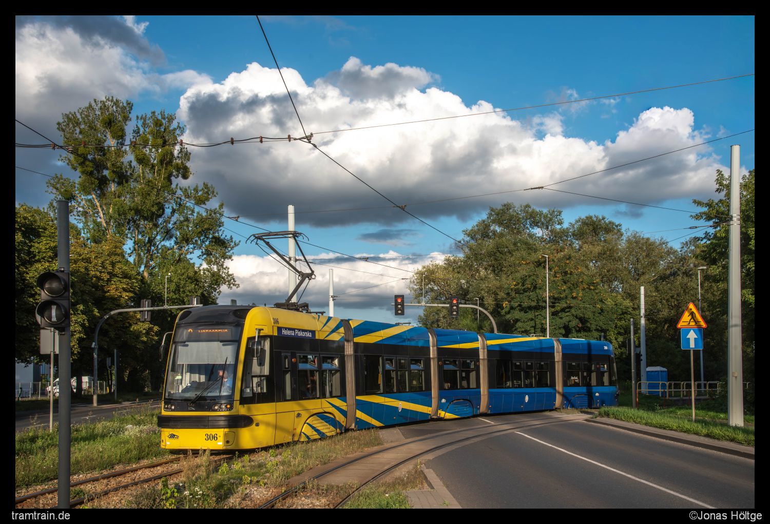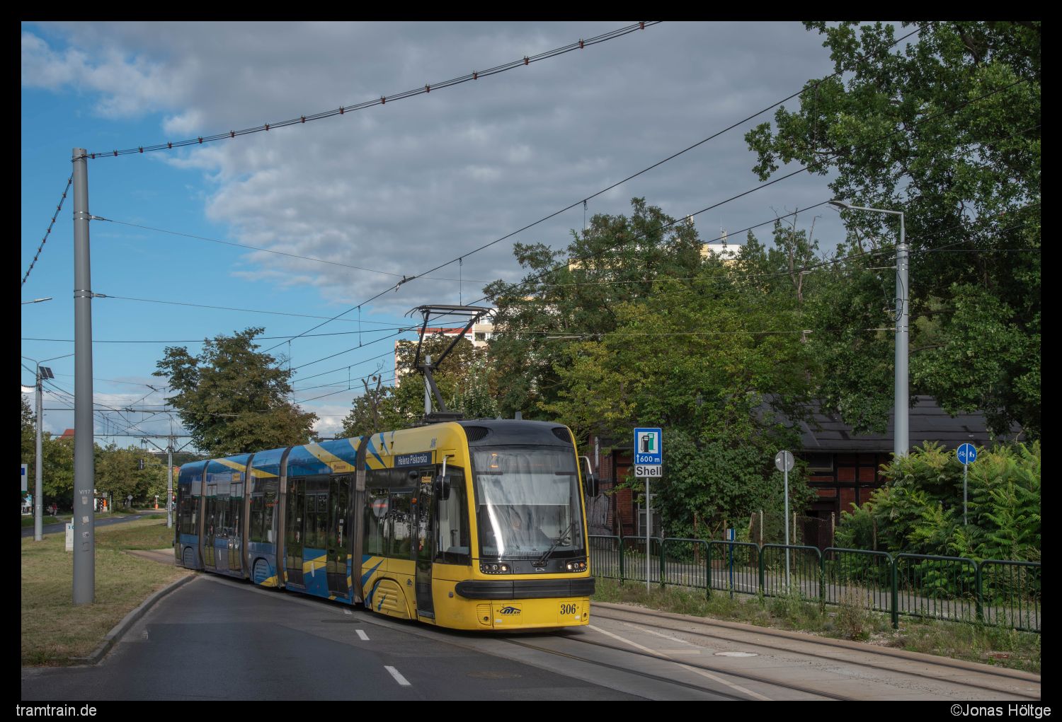 Die nächsten zwei Bildversuche wurden durch Autos zugefahren. So gelang mir ein letztes Straßenbahnbild des Tages bei der Ausfahrt aus der Endstation Elana B. Zugegeben hätte sich ein dreiteiliger Pesa hier deutlich besser gemacht, um die Schatten aus dem Fahrzeug raus zu halten, ich konnte es mir aber nicht aussuchen und nahm so auch Wagen 306 als Motiv an. Zumindest schien die Sonne auf den Wagen, wenn auch mit etwas nervigen Schatten. Es sollte gleichzeitig das letzte Straßenbahnbild des Tages gewesen sein.