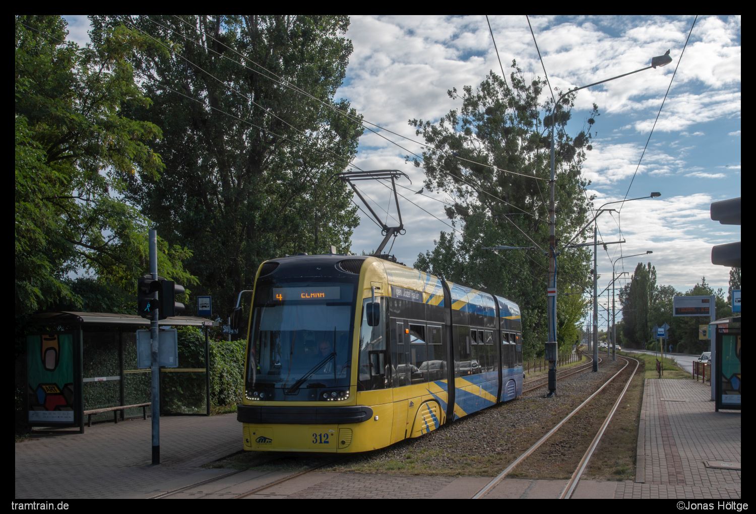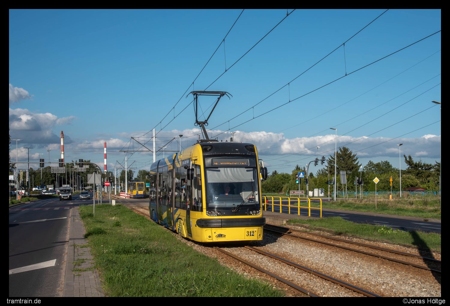 Nach dem kurzen abwechslungsreichen Stück, welches sich leider größtenteils bereits im Schatten befand, kam erneut das typische Bild der Thorner Außenstrecken zum Vorschein. In Straßenmitte ging es eine große Straße entlang und die Motivvielfalt am Rande der Strecke hielt sich in Grenzen. Bei dem nun sonnigen Wetter wollte ich mir aber keine Bildoption entgehen lassen und lichtete den zurückkehrenden Wagen 312 nahe der Station Tofama ab.