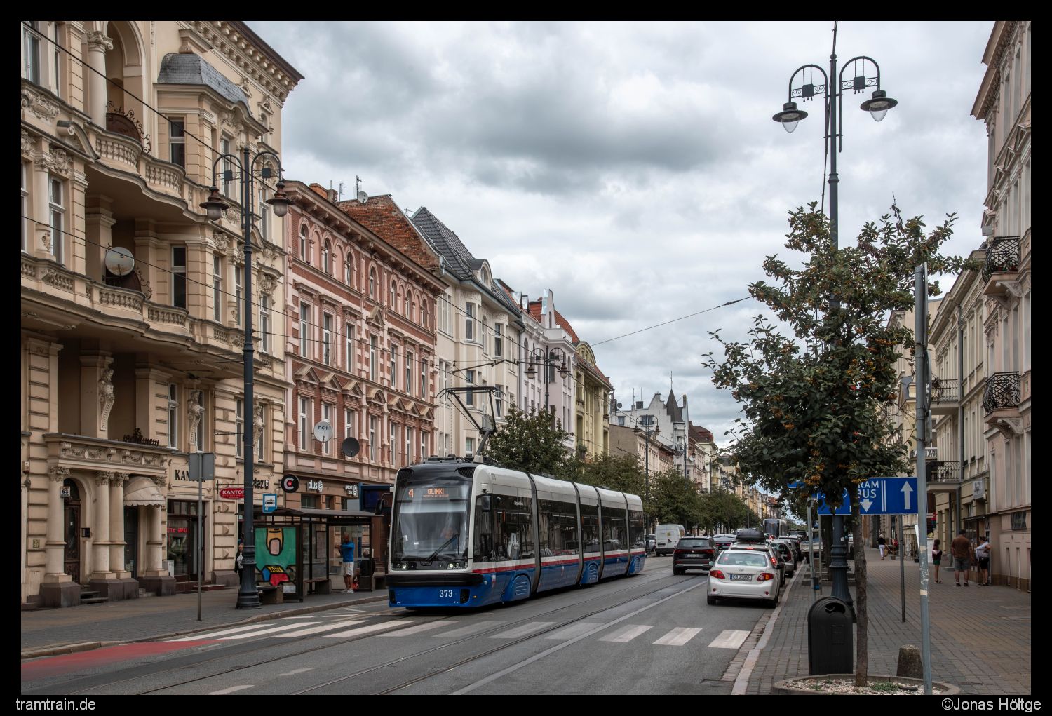 Inzwischen befand ich mich an der Station Gdańska – Cieszkowskiego. Auch hier erhoben sich neben der Straße einige schöne Häuserfassaden. Hier dauerte es gleich fünf Versuche, bis endlich ein Bild gelang. Obwohl die Wagen an der Station ohnehin anhalten mussten, waren immer Autos ins Bild gefahren. Jetzt klappte es endlich mit Wagen 373.