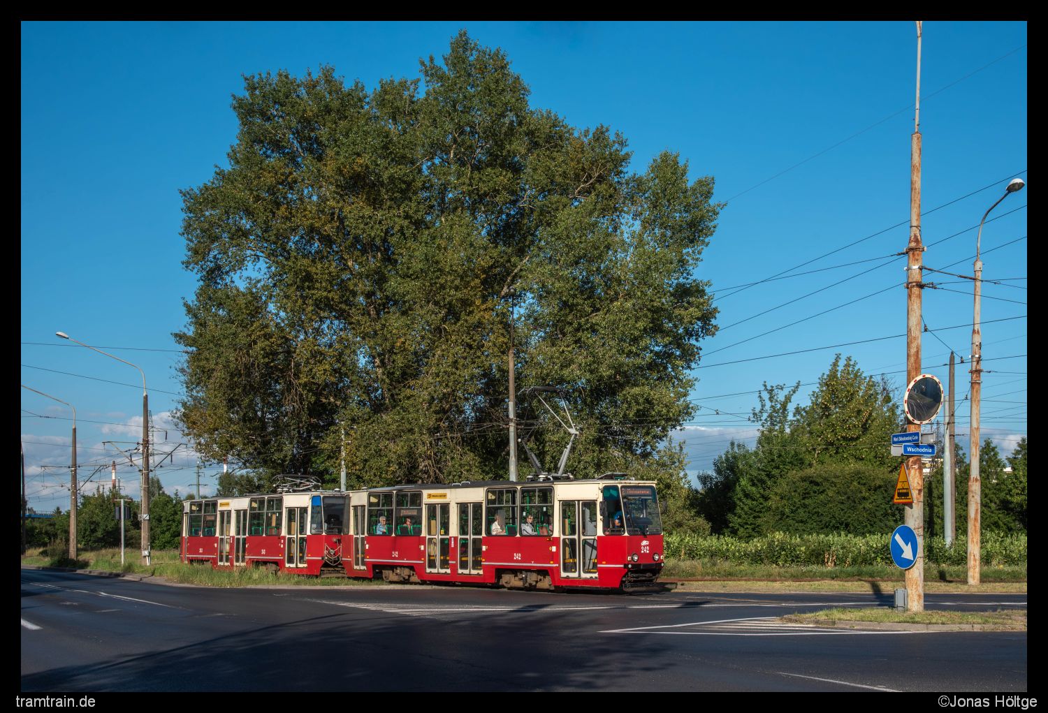 Jetzt endlich war es soweit. Die Sonne hatte sich final hinter den Wolken hervorgekämpft und präsentierte sich passend zum Konstal 805Na Doppel bei einem weiteren Bild an der Station Wschodnia. Hier draußen wurde der Linienverlauf sehr rustikal und führte durch eine alte Industriekulisse. Mit etwas Glück gelang mir ein Bild ganz ohne Autos quer über die durchaus dicht befahrende Straße. Mit Doppel 242+243 zeigte sich das gleiche Doppel wie bereits bei meinem ersten Bild des Fahrzeugtyps.