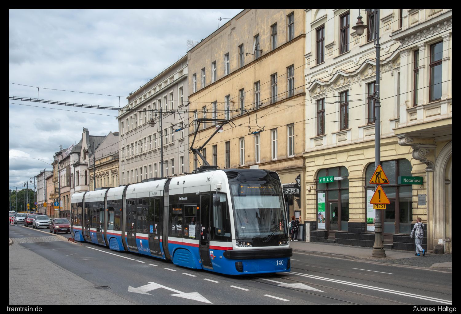 Inzwischen war ich fast an der Station Plac Wolności angekommen. Hier bot sich in Mitten der sonst relativ monoton wirkenden restaurierten Häuserfassaden eine kleine Abwechslung. An einer großen Querstraße wurden die Häuserfassaden unterbrochen und es mischte sich ein Betonklotz dazwischen. Ein interessanter Kontrast, den ich hier mit Wagen 118 festhielt.