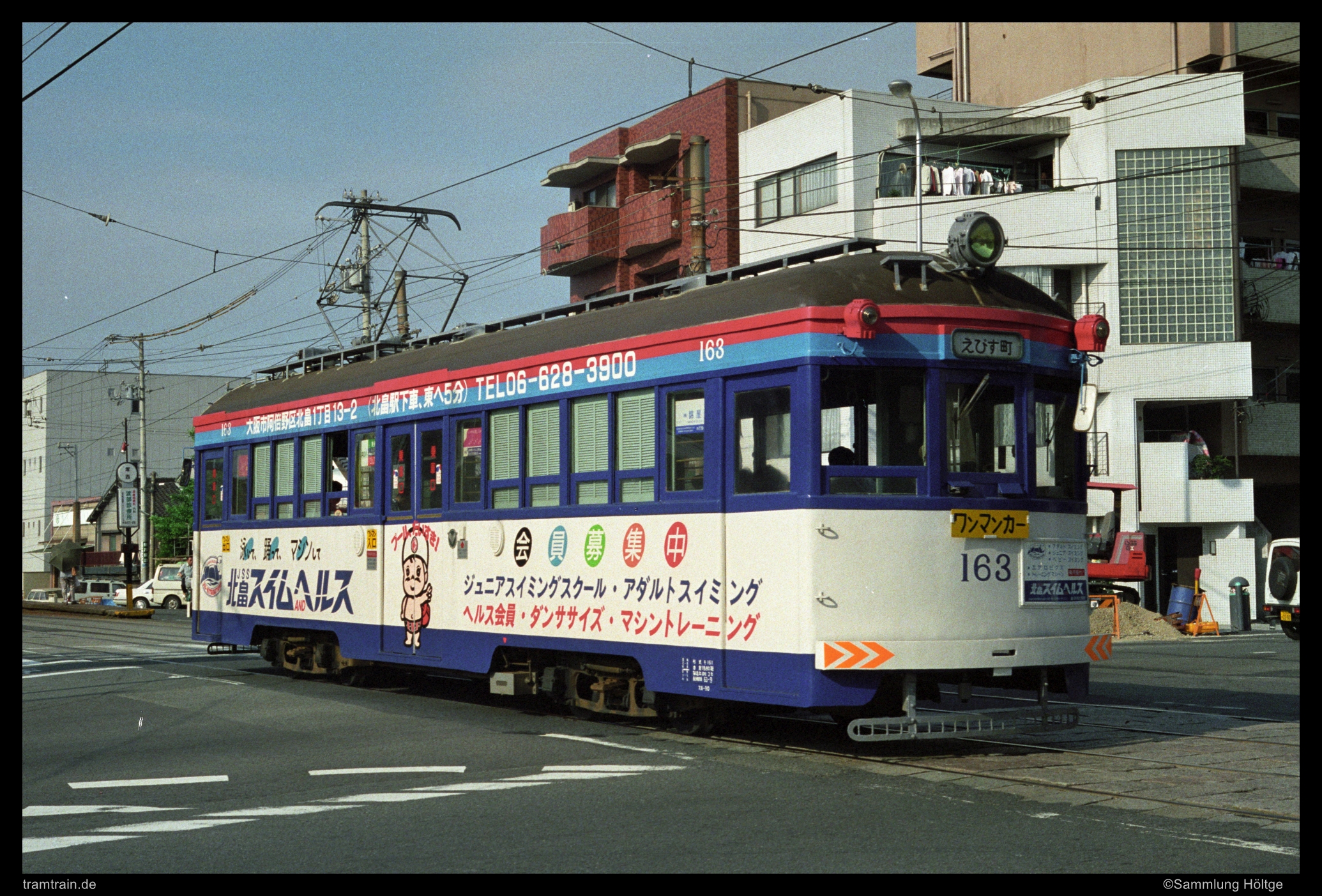 Bis zur Inbetriebnahme der Baureihen 601 und 701 war unter anderem auch die Baureihe 161 in den 90er-Jahren noch fester Bestandteil der Hankai Tramway. Hier der Wagen 163 aus der Kawasaki-Serie am 26. Mai 1991.