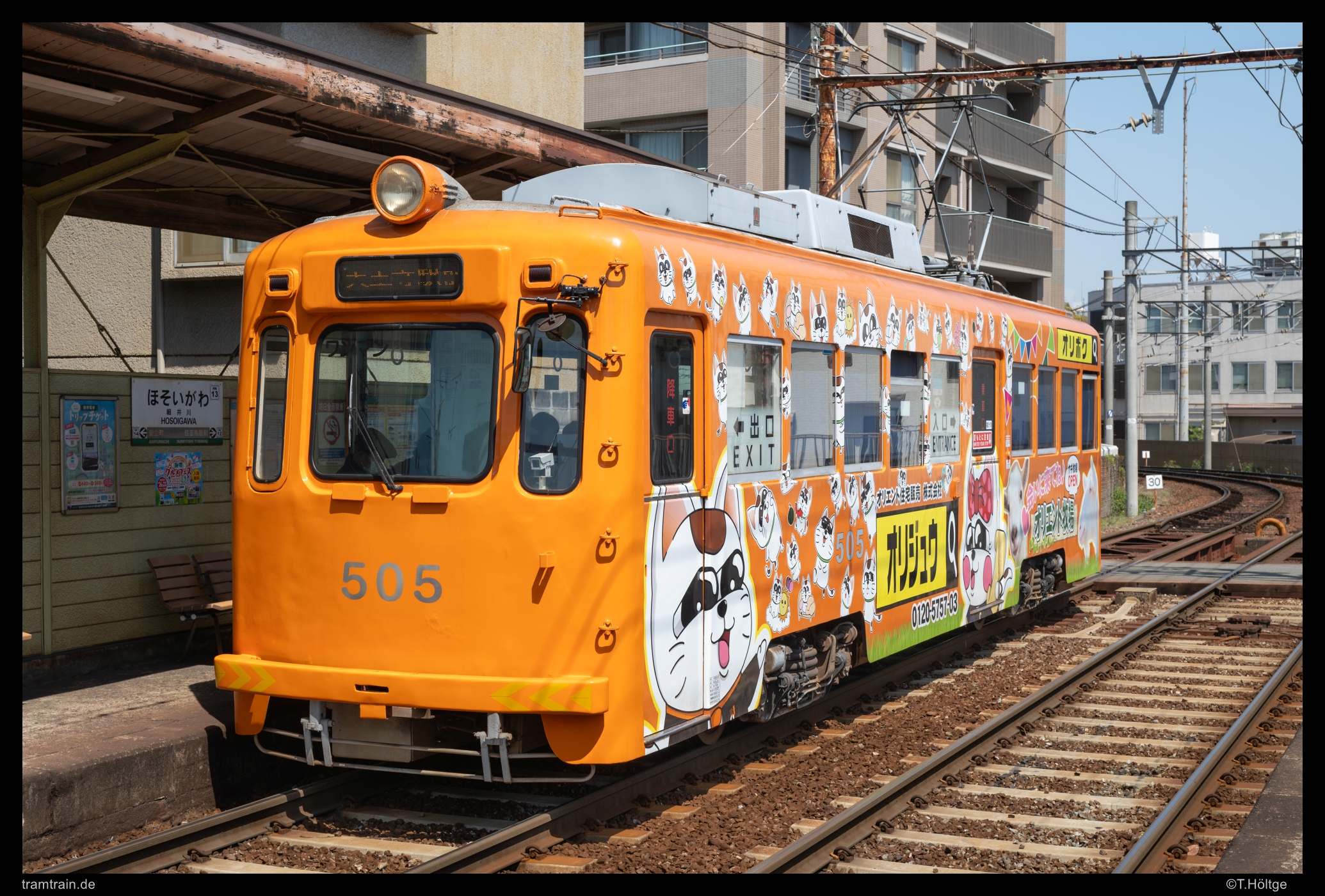 Wagen 505 stand am 14. April 2025 gemeinsam mit 355 den ganzen Tag über auf der Gesamtlinie im Einsatz. Die Wagen 501 und 503 verstärkten zur Rush Hour den Takt zwischen Abikomichi und Tennojiekimae.