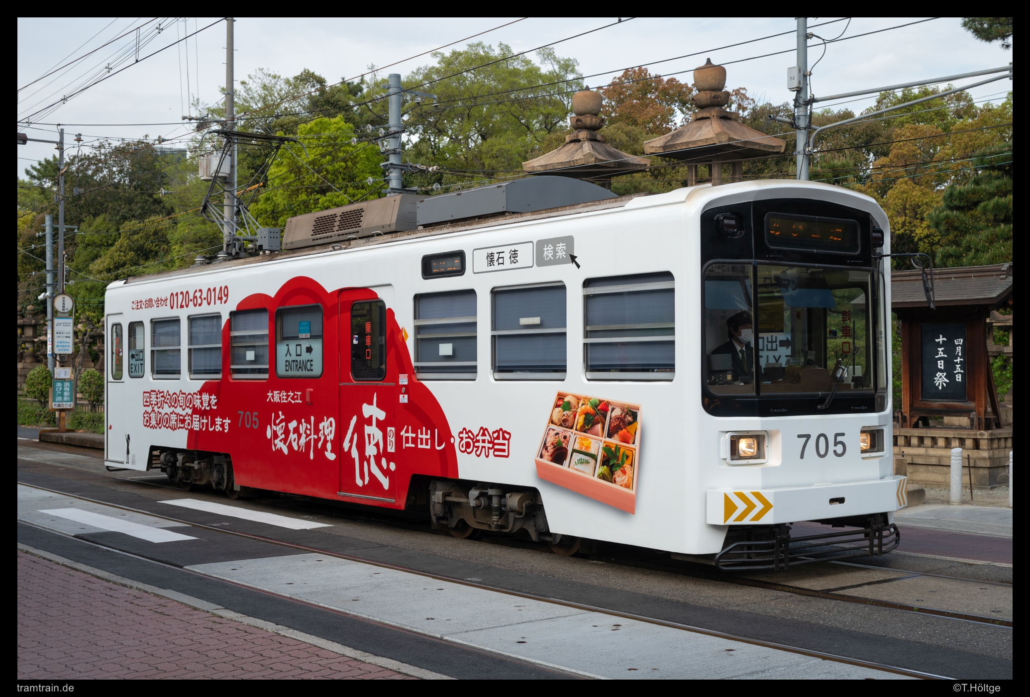 Wagen 705 neben zwei der großen Steinlaternen entlang des Sumiyoshi-Taisha-Schreins.