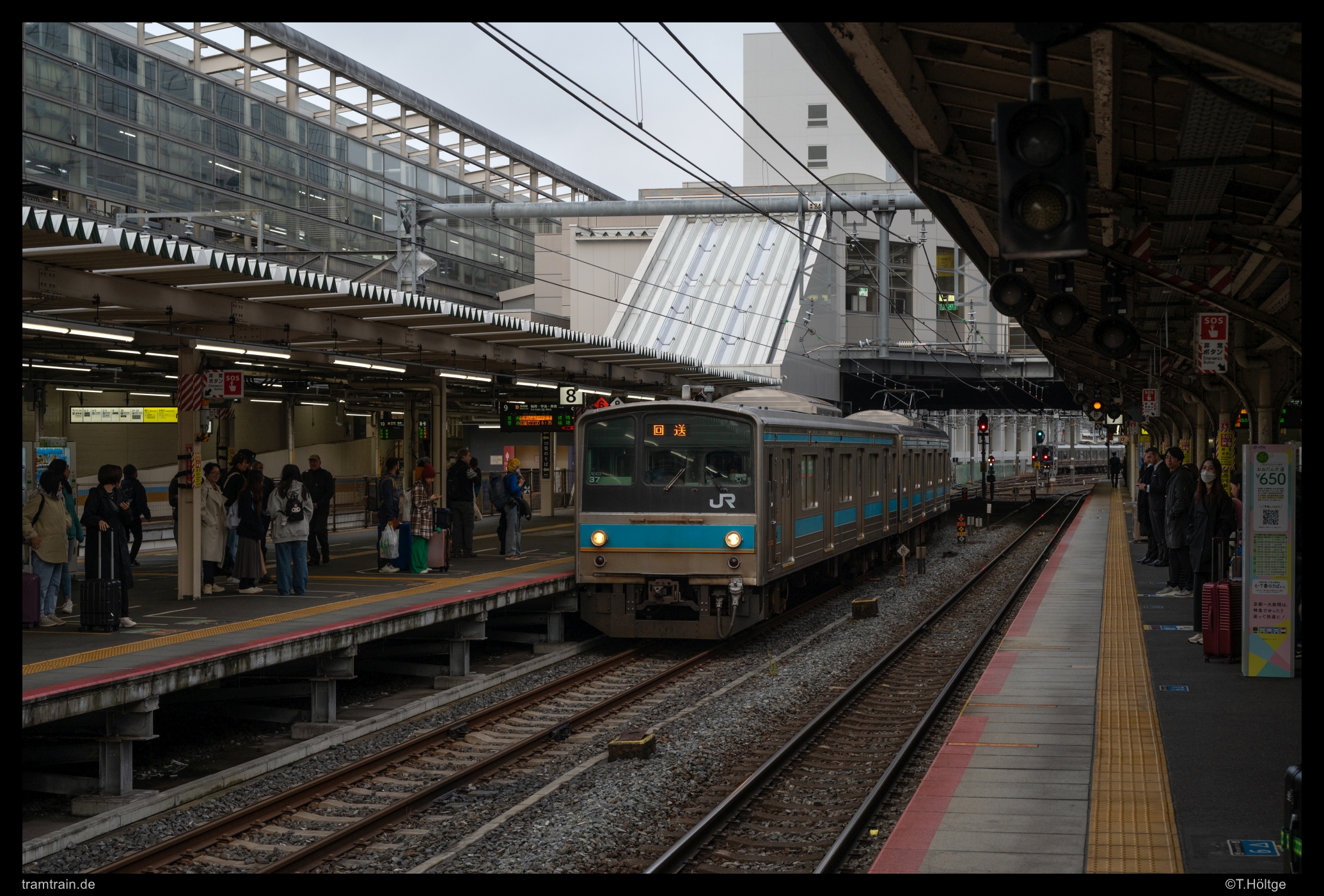 Beim Warten auf unseren Haruka kommt noch eine der unzähligen Blechdosenbaureihen am Bahnsteig 6 der Kyōto Station durch.
