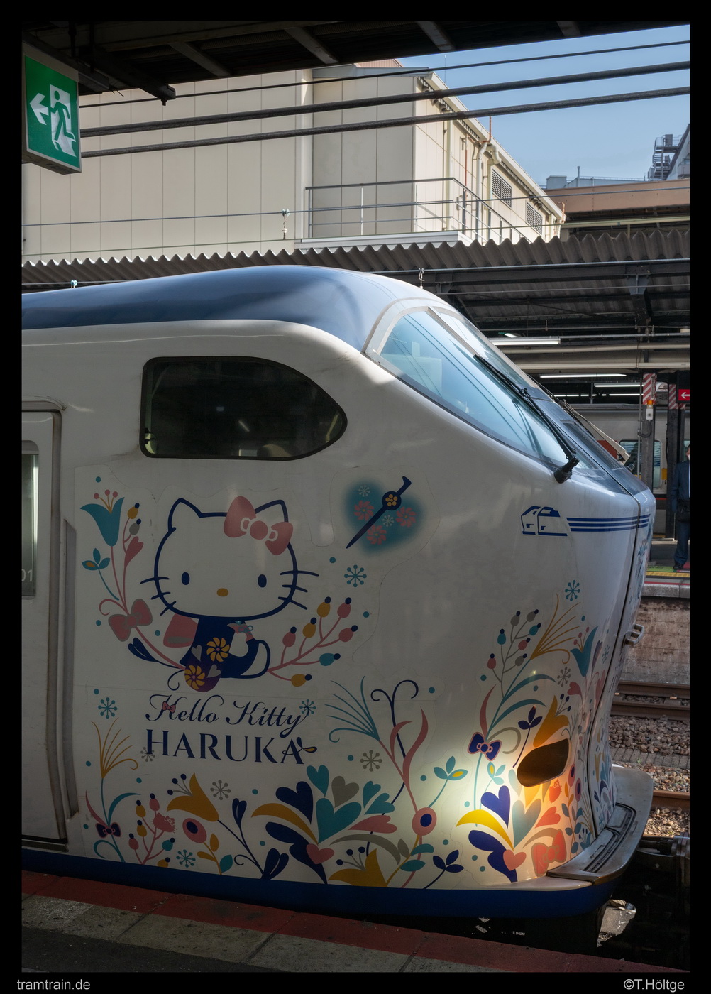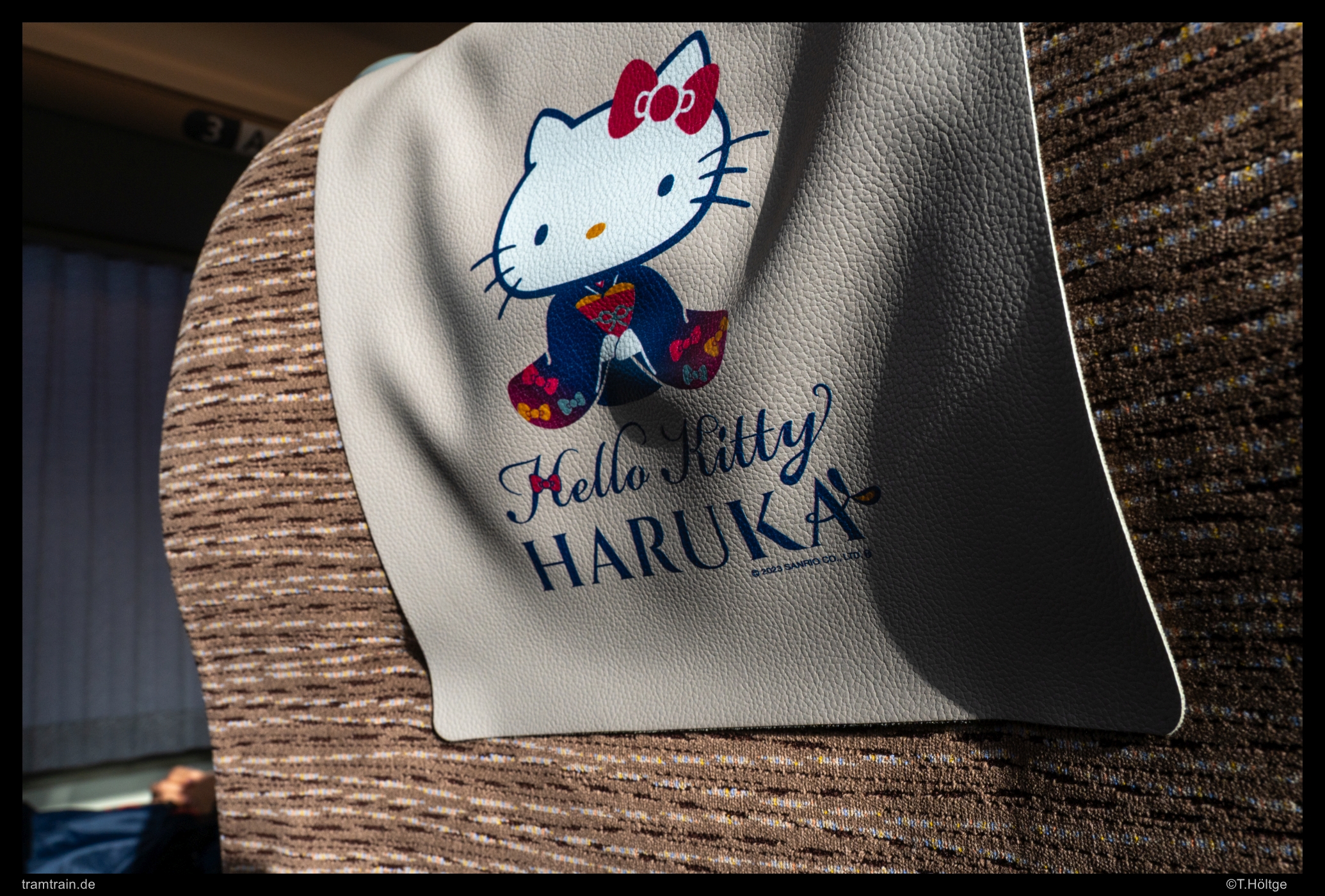 Unser Haruka war wiedermal einer der vielen Motto-Züge der japanischen Kapspur und ganz im Zeichen von Hello Kitty gehalten, inklusive Außenbemalung, Kopfpolster und Selfie-Spiegel an den Wagenübergängen. In die aufgehende Sonne hinein war es eine sehr angenehme Fahrt im nicht überfüllten Haruka hinüber nach Ōsaka.