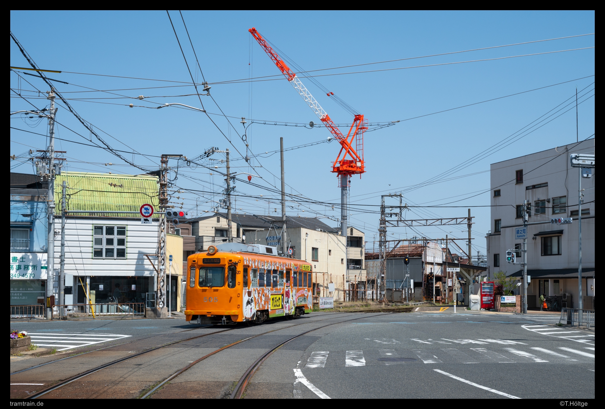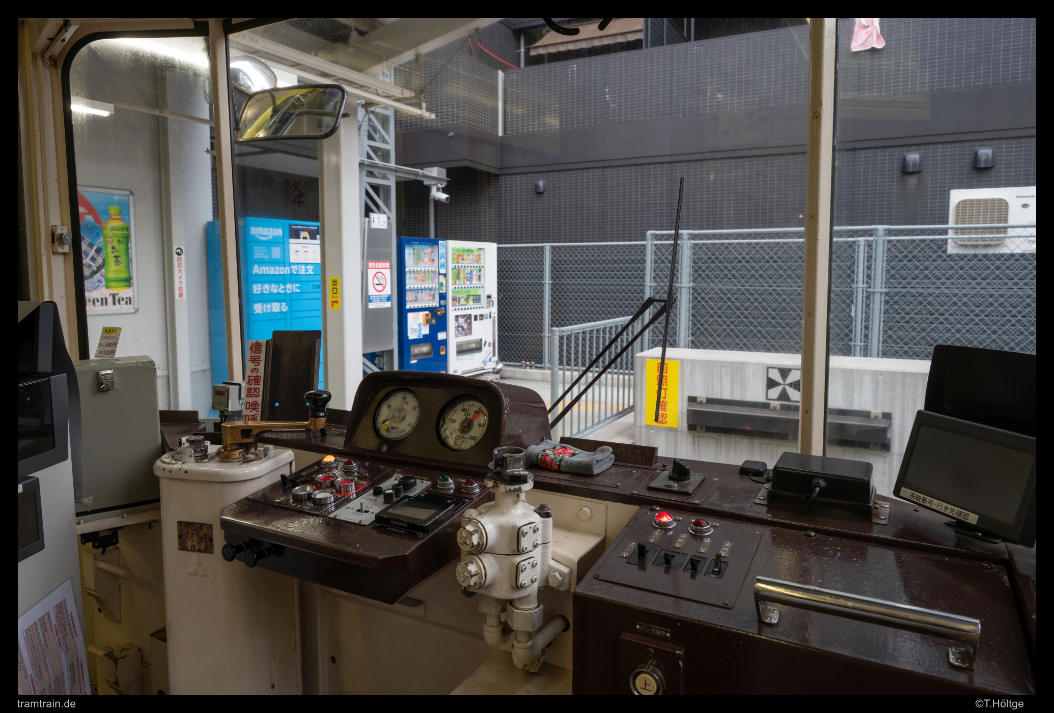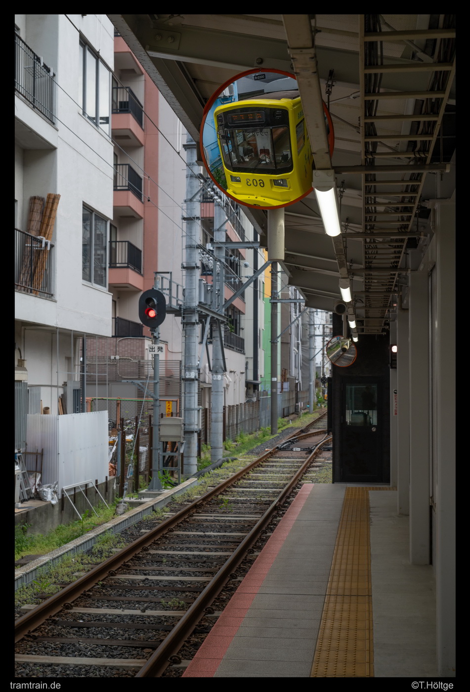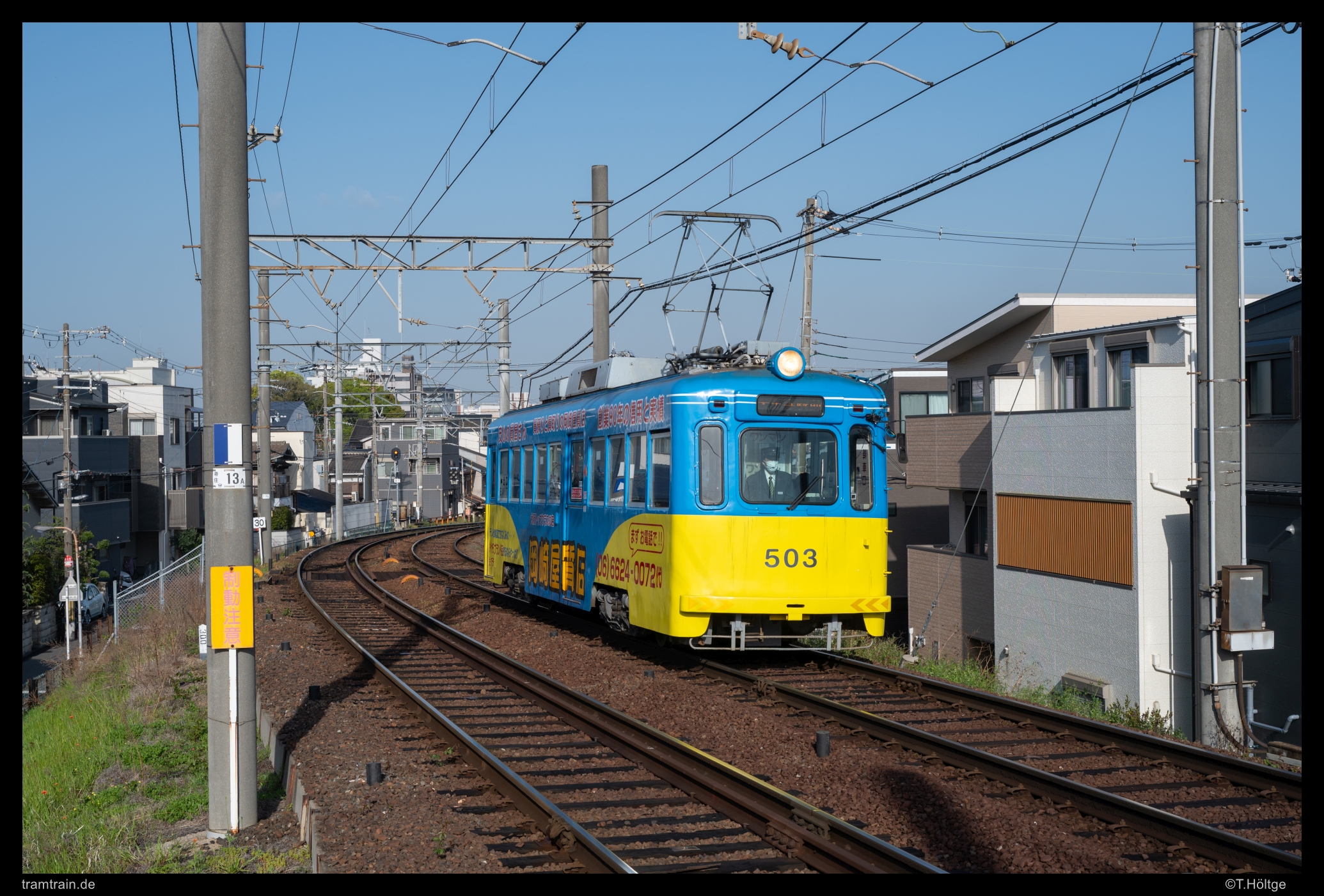Die Endstation war hier derart unfotogen verbaut, dass wir gleich in den erstbesten Wagen sprangen und durch die noch langen Hochhausschatten dem ersten Sonnenspot entgegenfuhren. Der fand sich erst nach fast vier Kilometern eine Haltestelle vor dem Zusammentreffen mit der Zweiglinie an der Haltestelle Kaminoki, die auf einer Brücke über die Nankai Line gelegen ist. Kaum aus unserem 600er gefallen, kam auch schon ein Altwagen in Gestalt des 503 die Brücke hinauf geheult.