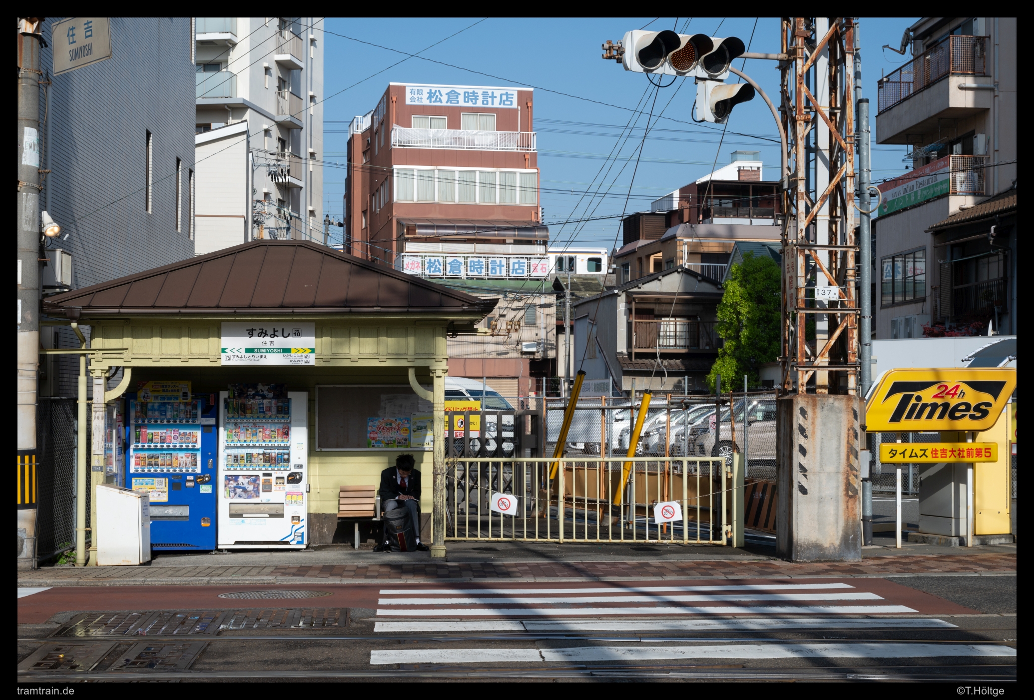Aktuell schienen die Bahnen hier um halb acht fast im Sichtabstand zu fahren. Und der Sichtkontakt bestand nicht nur auf den langen Gerade 😉 So sprangen wir wenig später in den nächsten Kurs ein und fuhren gerade einmal eine Haltestelle weiter zum Abzweig der beiden Linien. Dort befindet sich neben dem großen Sumiyoshi-Schrein einer der Streckenabschnitte im Straßenplenum und die Sonne schien bereits schön in die Straße.