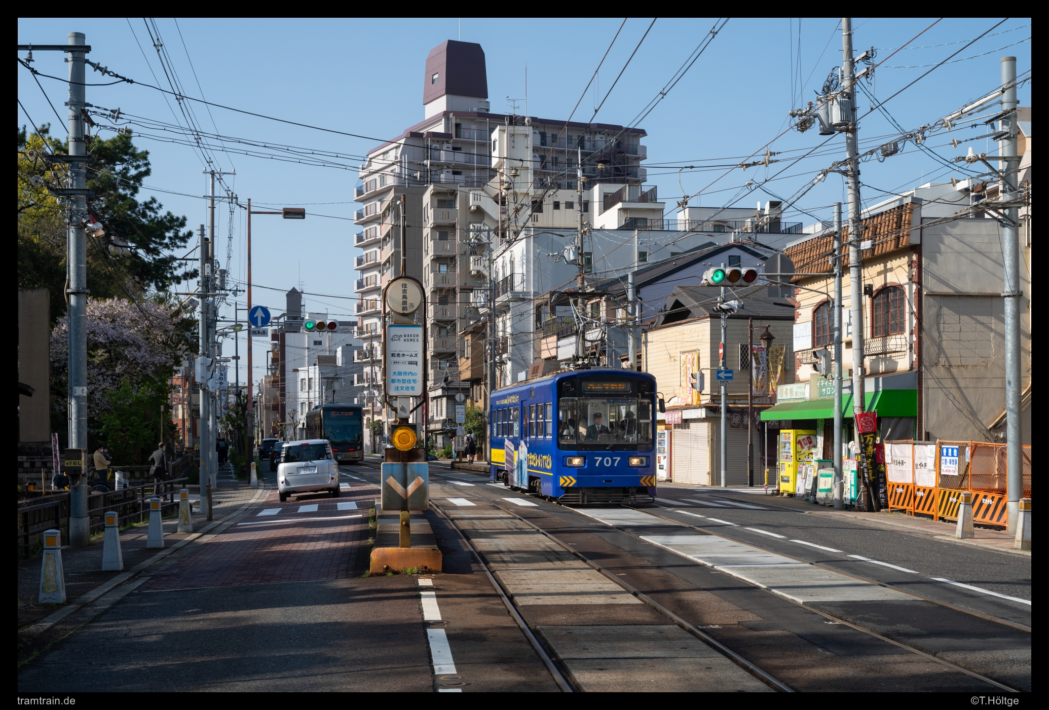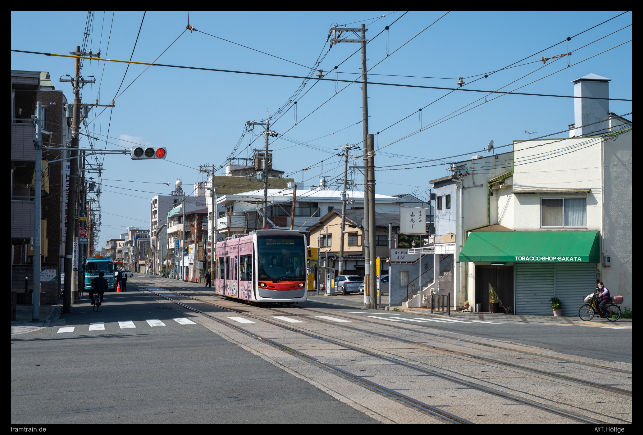 Wagen 505 verlässt die Haltestelle Hosoigawa Richtung Tennojiekimae. Anders als im Straßenplenum, sind die Straßenkreuzungen auf den Abschnitten mit eigenem Bahnkörper abseits der Straßenverläufe durchwegs gesichert. Der sich daraus ergebene Unterschied in der Reisegeschwindigkeit auf den verschiedenen Abschnitten der Strecke ist eklatant.