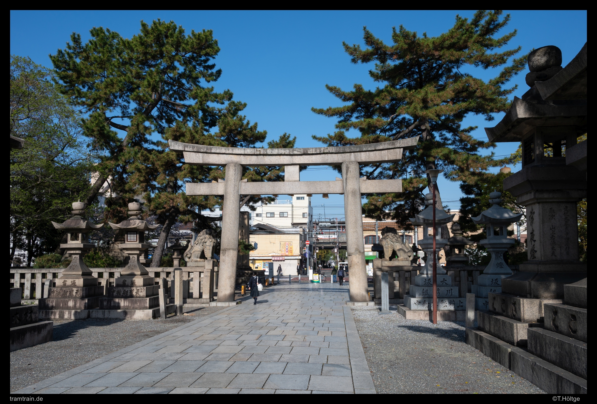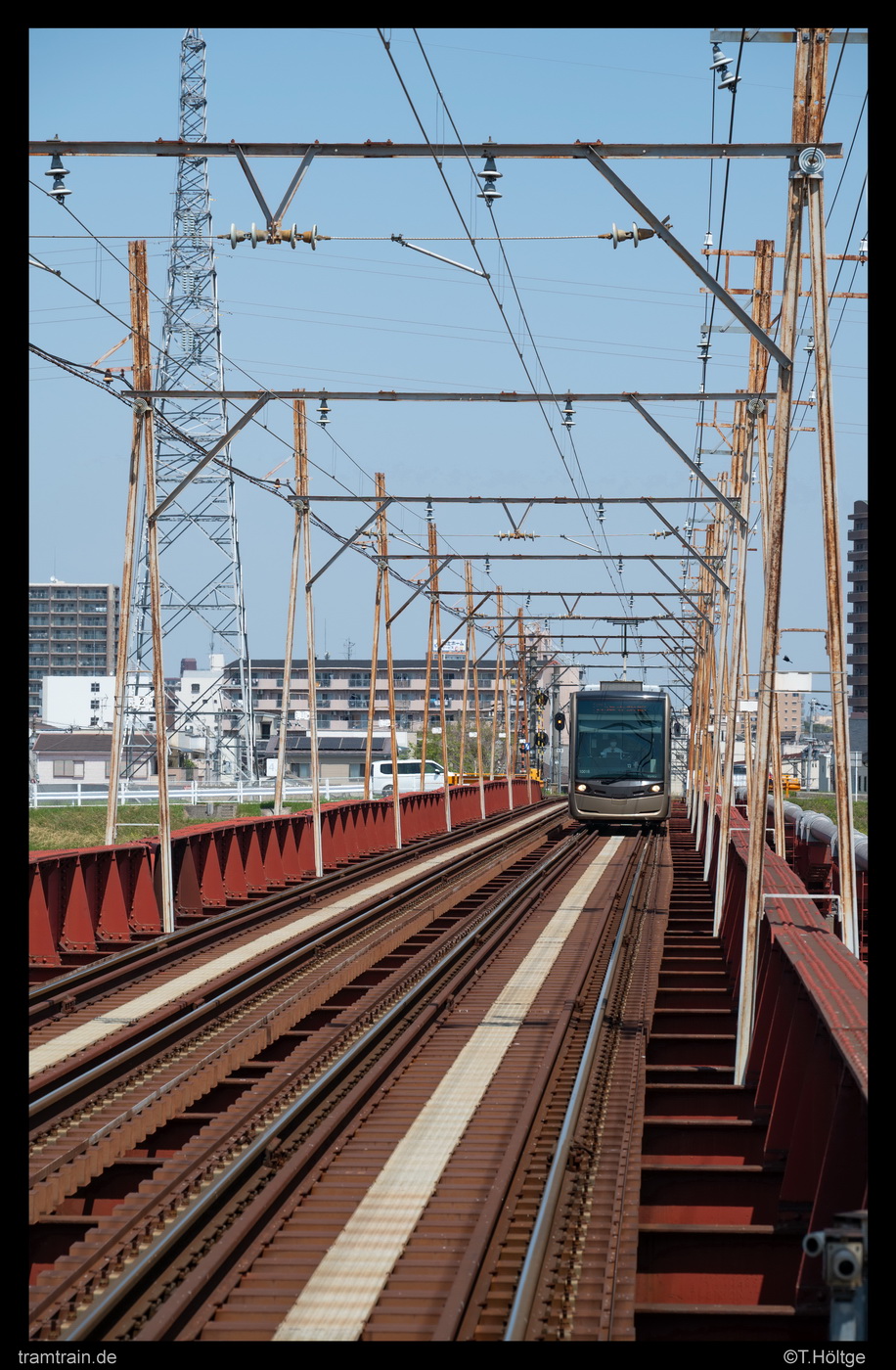 An der nächsten Haltestelle Sumiyoshitoriimae befindet sich der Haupteingang in den Schrein. Dahinter endet Richtung Sakai der kurze Straßenabschnitt auch schon wieder und es geht für fast drei Kilometer abseits von Straßenverläufen auf eigenem Bahnkörper am Depot vorbei und über die große Yamato-Brücke. 707 erreicht hier die Haltestelle Sumiyoshitoriimae Richtung Tennojiekimae.