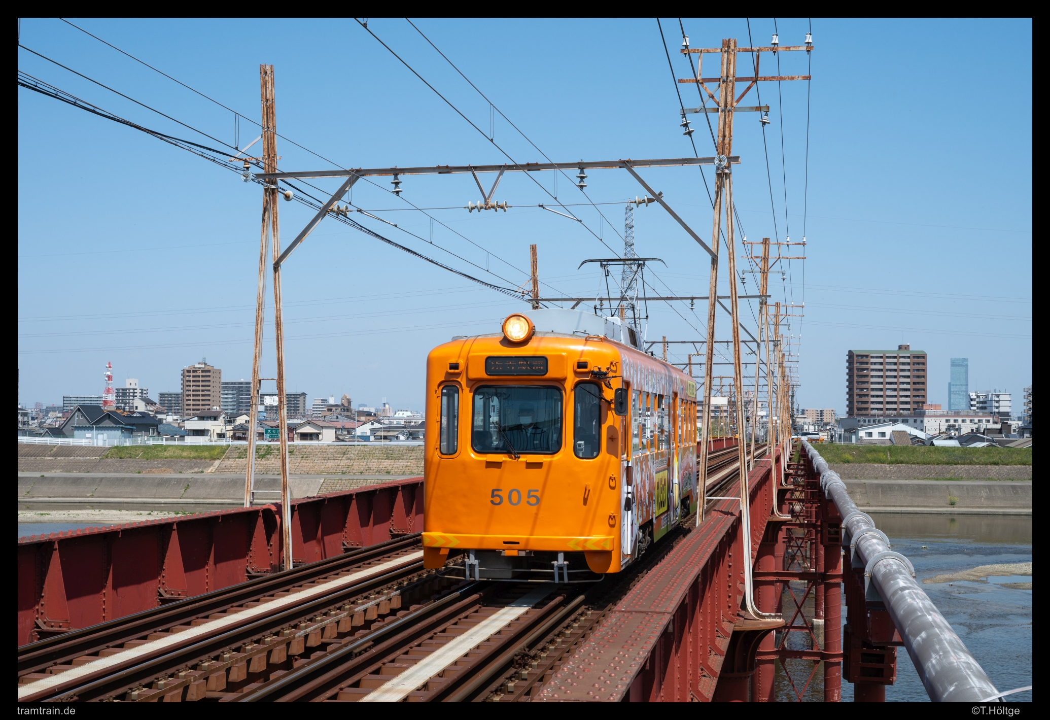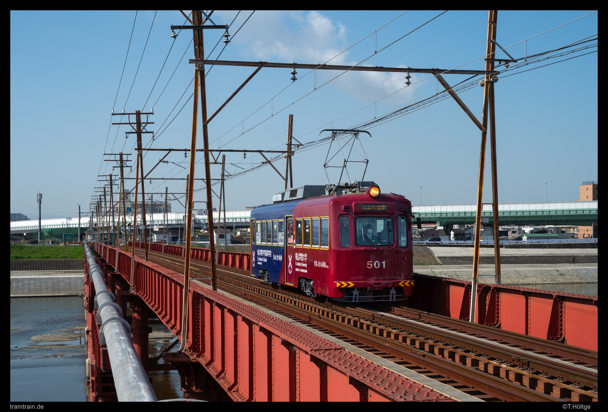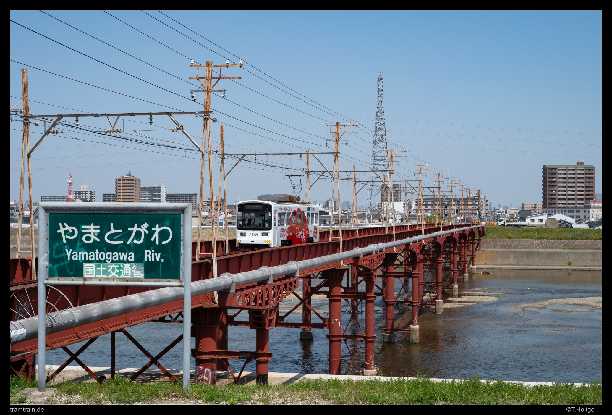 Wagen 501 auf der großen Yamato-Brücke zwischen den Haltestellen Yamatogawa und dem Depot unweit der Haltestelle Abikomichi.