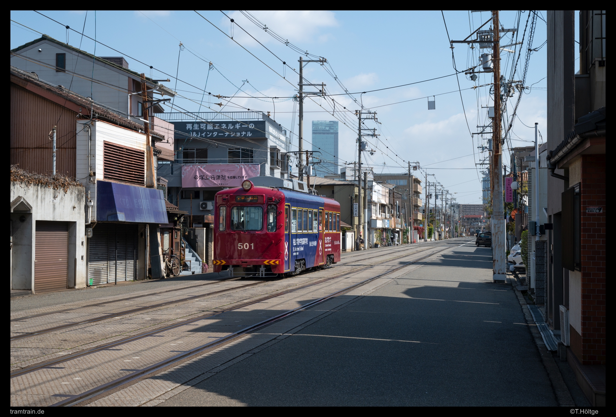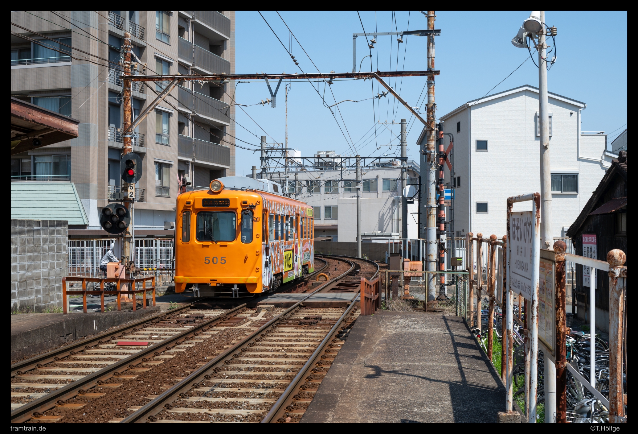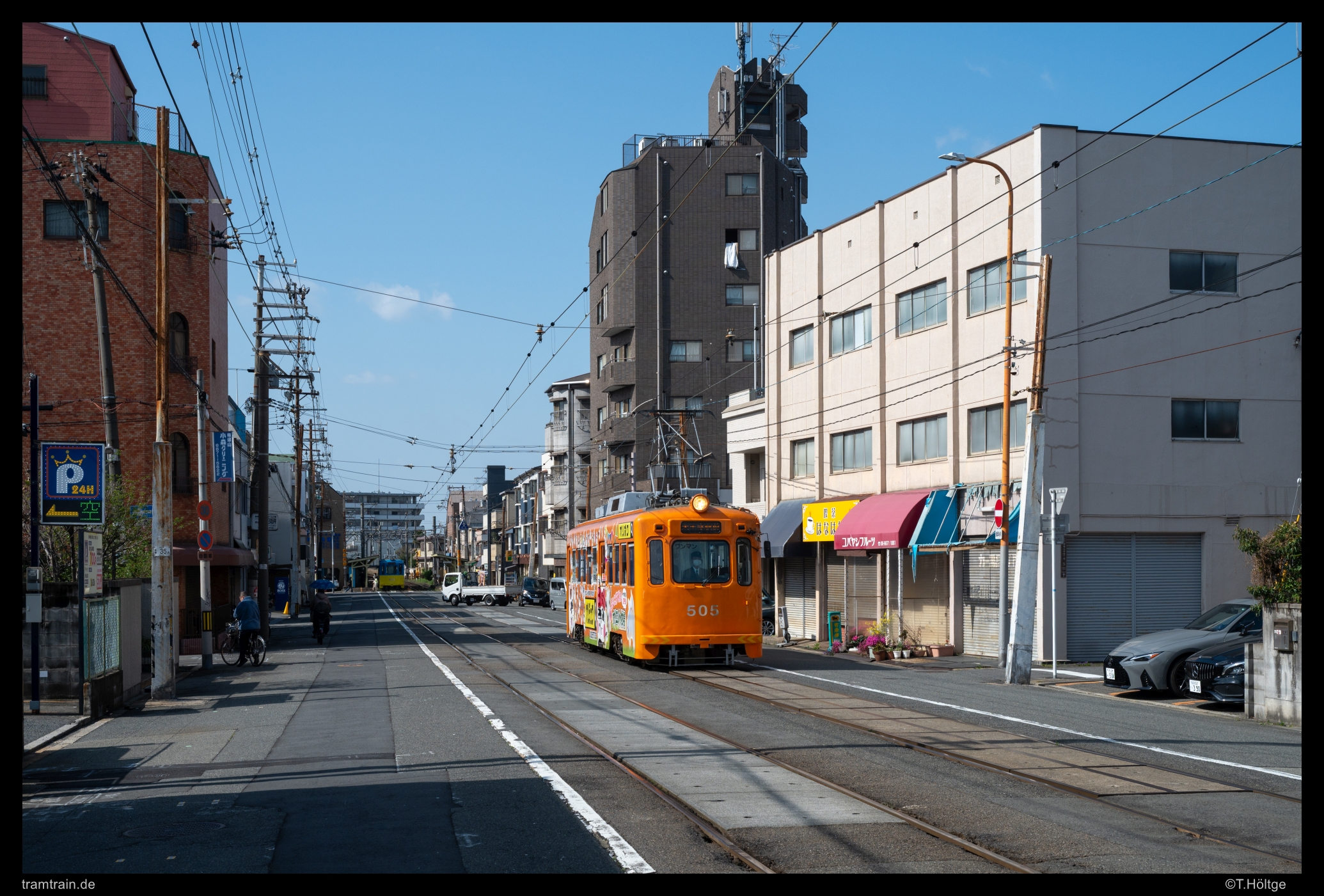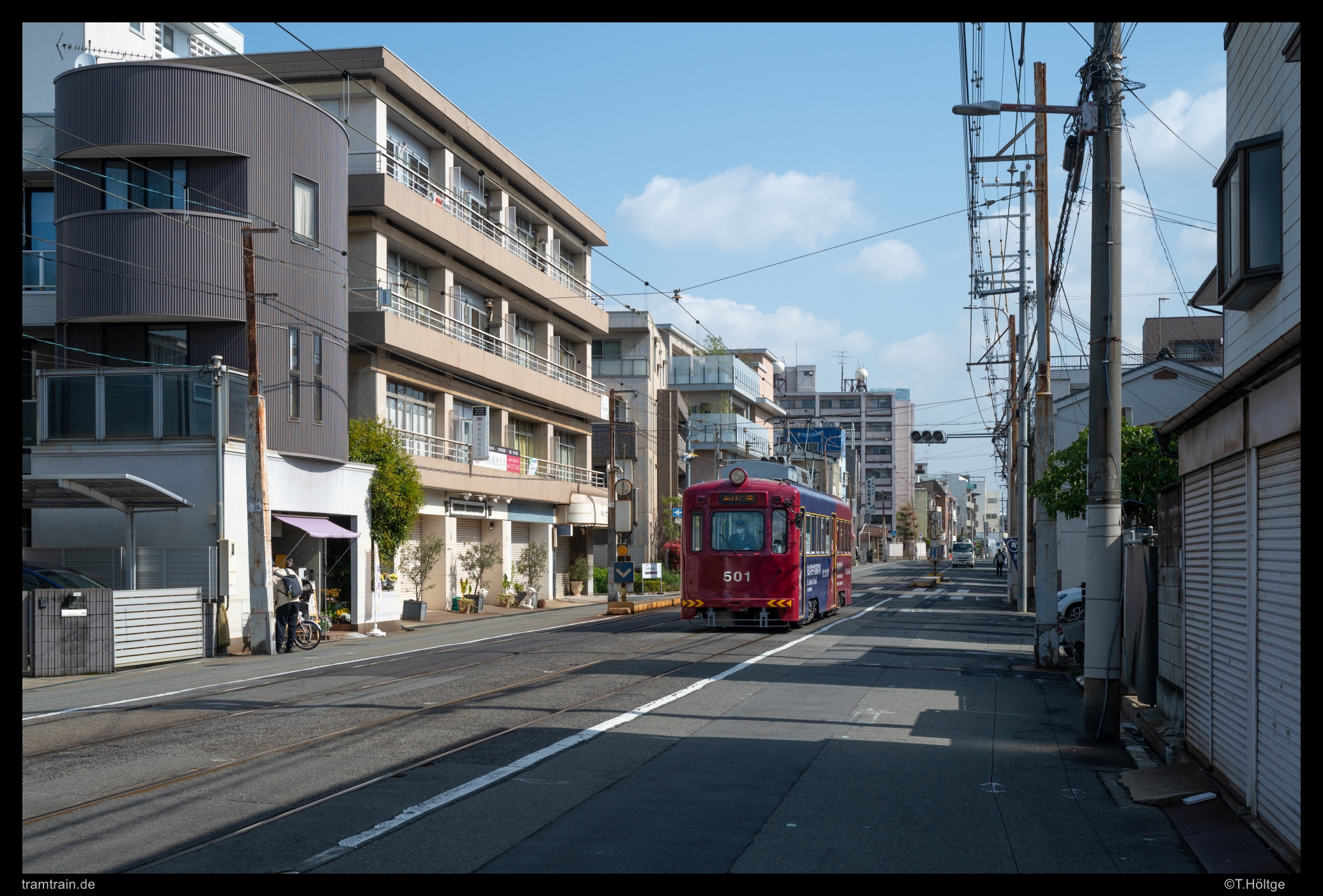 Am südlichen Ende des Boulevards geht es dann wieder auf besonderen Bahnkörper mit gesicherten Übergängen und schon dürfte sich die Reisegeschwindigkeit locker verdreifachen. Ich stieg aber schon an der nächsten Haltestelle aus und lief durch die Nebengassen zu einer netten Stelle zurück, die mir eben im Vorbeifahren aufgefallen war. Die gefühlt einzige Wolke weit und breit versaute es mir nach einer Viertelstunde mit dem 355, sodass ich erneut auf den folgenden 505 wartete. Das war dann mal ein recht zeitaufwendiges Motiv gewesen. Dafür blieb aber Zeit, an dem schmalen Weg zwischen Trasse und niedrigen Wohnhäusern ein wenig das Leben der Japaner zu beobachten. Paar spielende Kinder beäugten mich interessiert, von den Erwachsenen wurde man wie immer höflich ignoriert. Zum Glück ist ja die Spezies der Bahnfuzzis recht verbreitet in Japan, da erntet man kaum zweifelnde Blicke, was man da im Schilde führt.