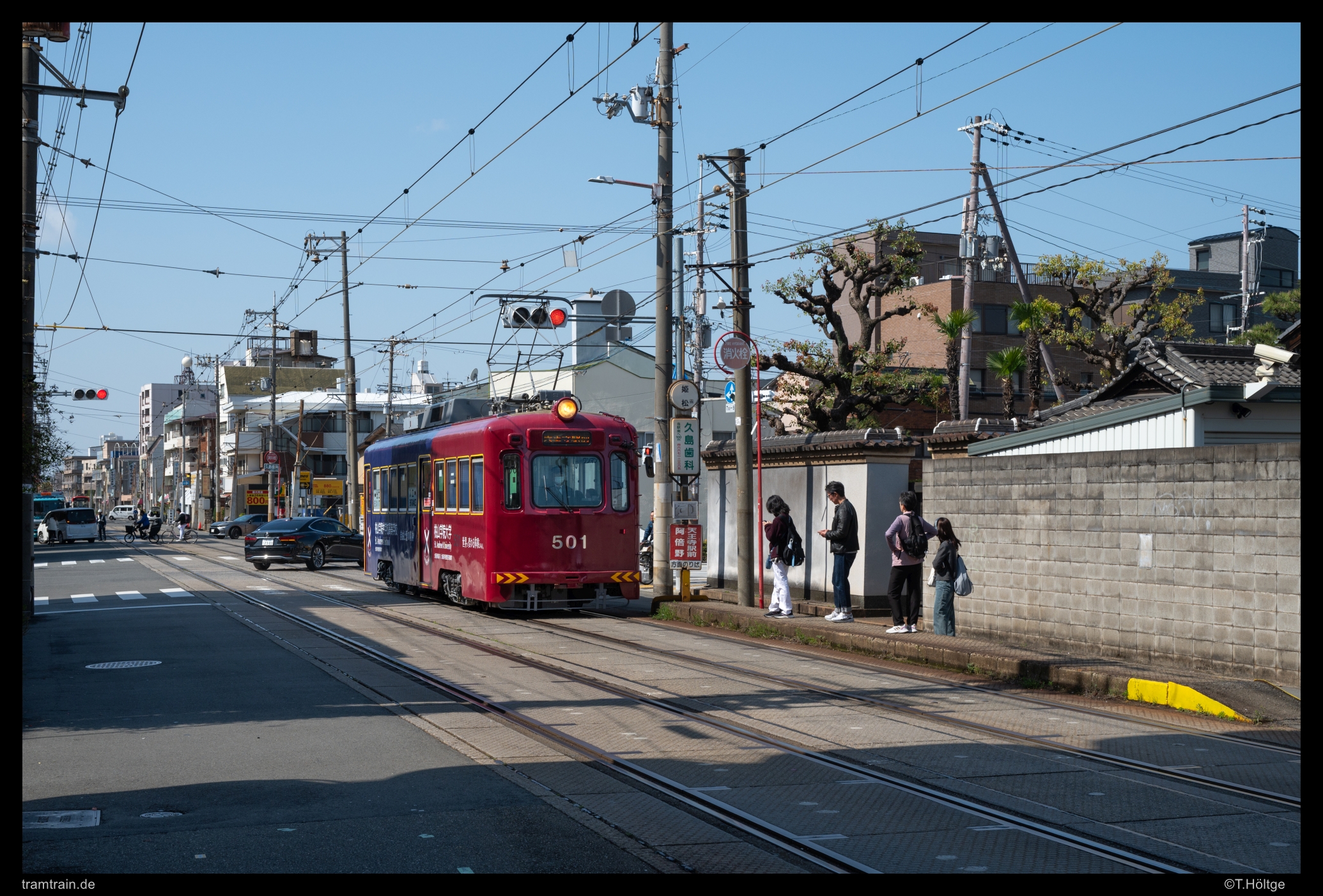 Bald darauf folgt auch schon der Wagen 501 auf seiner letzten Runde in der morgendlichen HVZ Richtung Tennojiekimae und erreicht die Haltestelle Himematsu. Die Haltestelle ist wiedermal äußerst primitiv ausgeführt und besteht nur aus einer schmalen Einstiegskante, die oft erst mit Einfahrt des Wagens betreten wird.