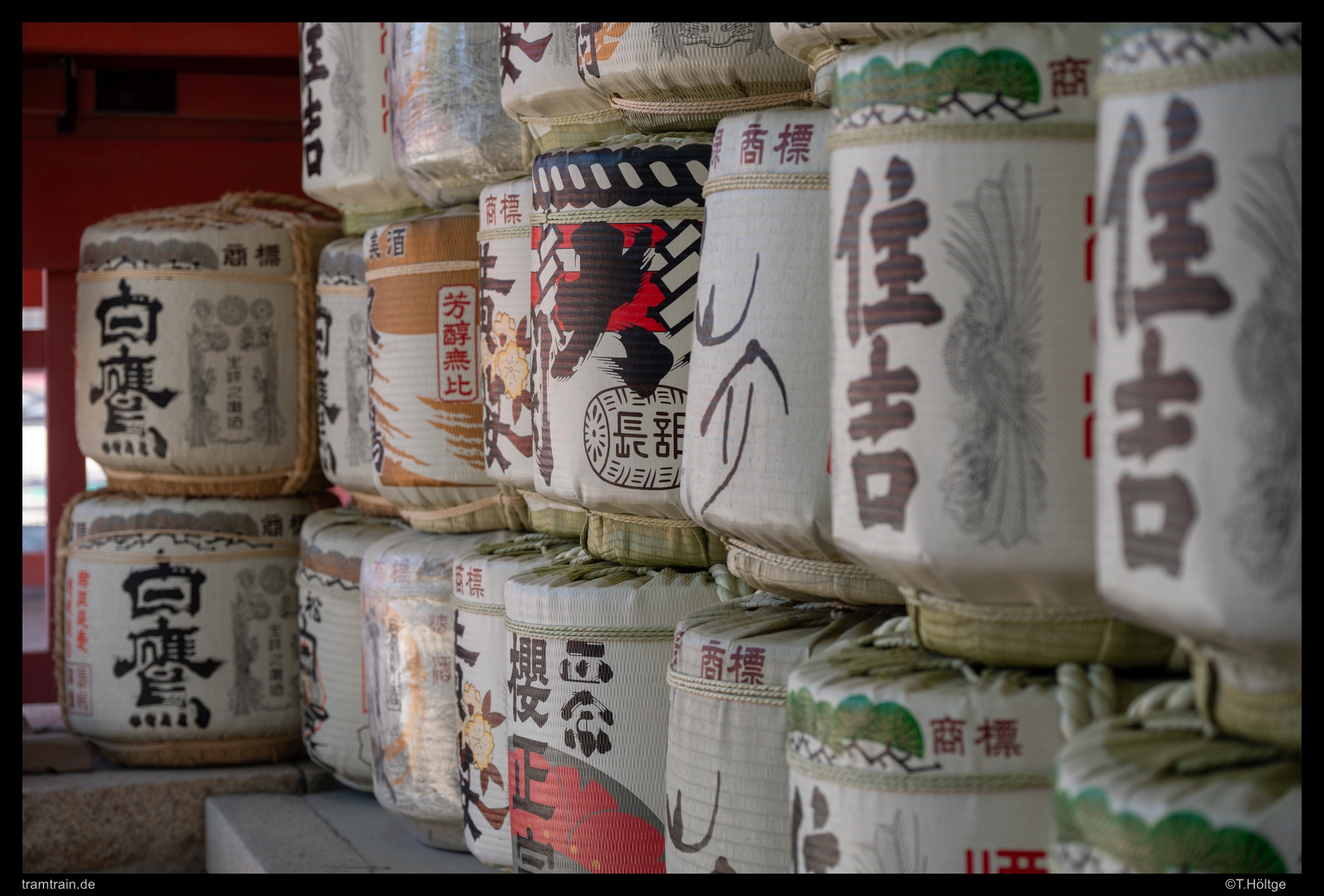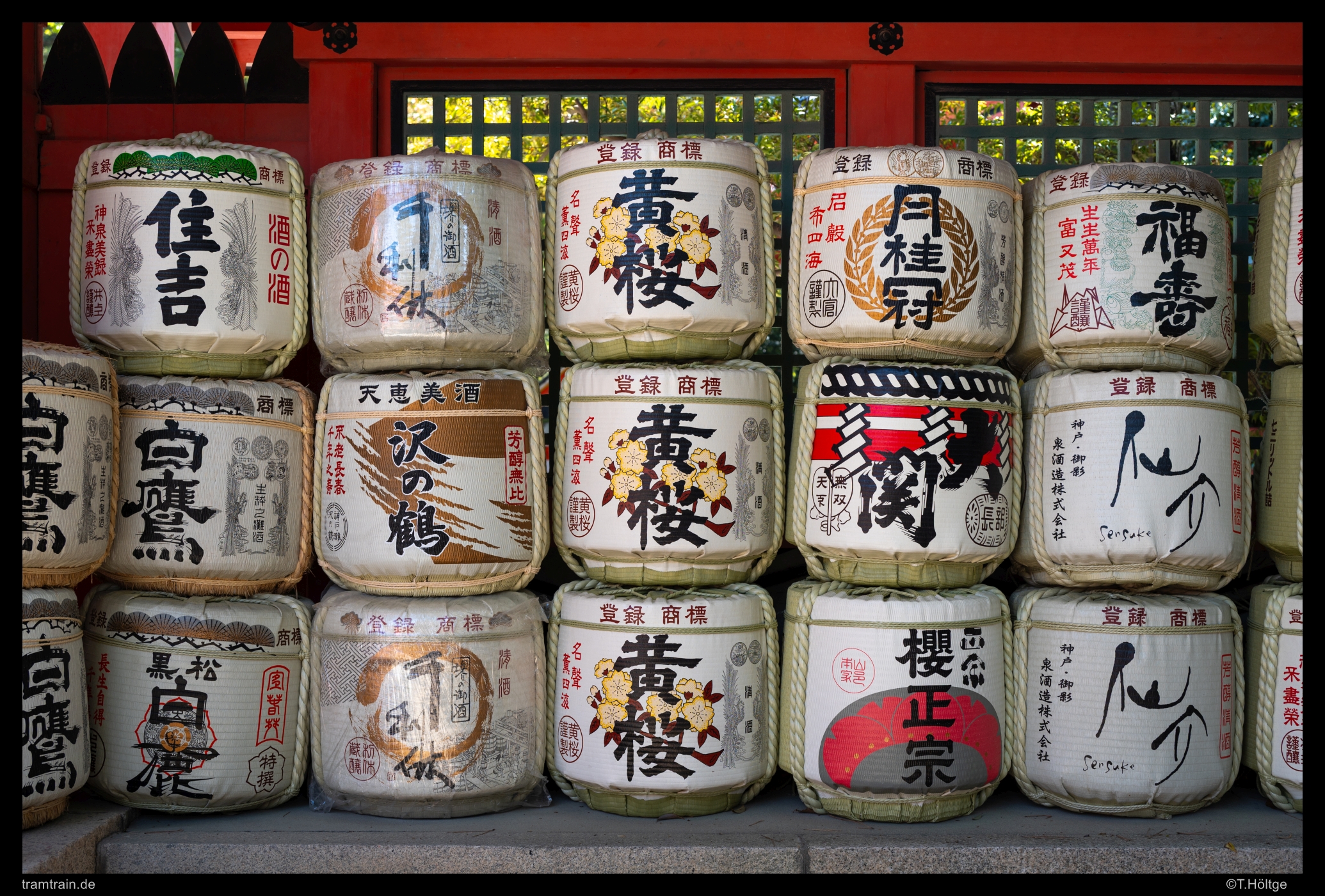 Die findet man im ganzen Land an Schreinen, wobei natürlich berühmte Schreine mehr Spenden bekommen und daher auch mehr Fässer herumstehen haben.