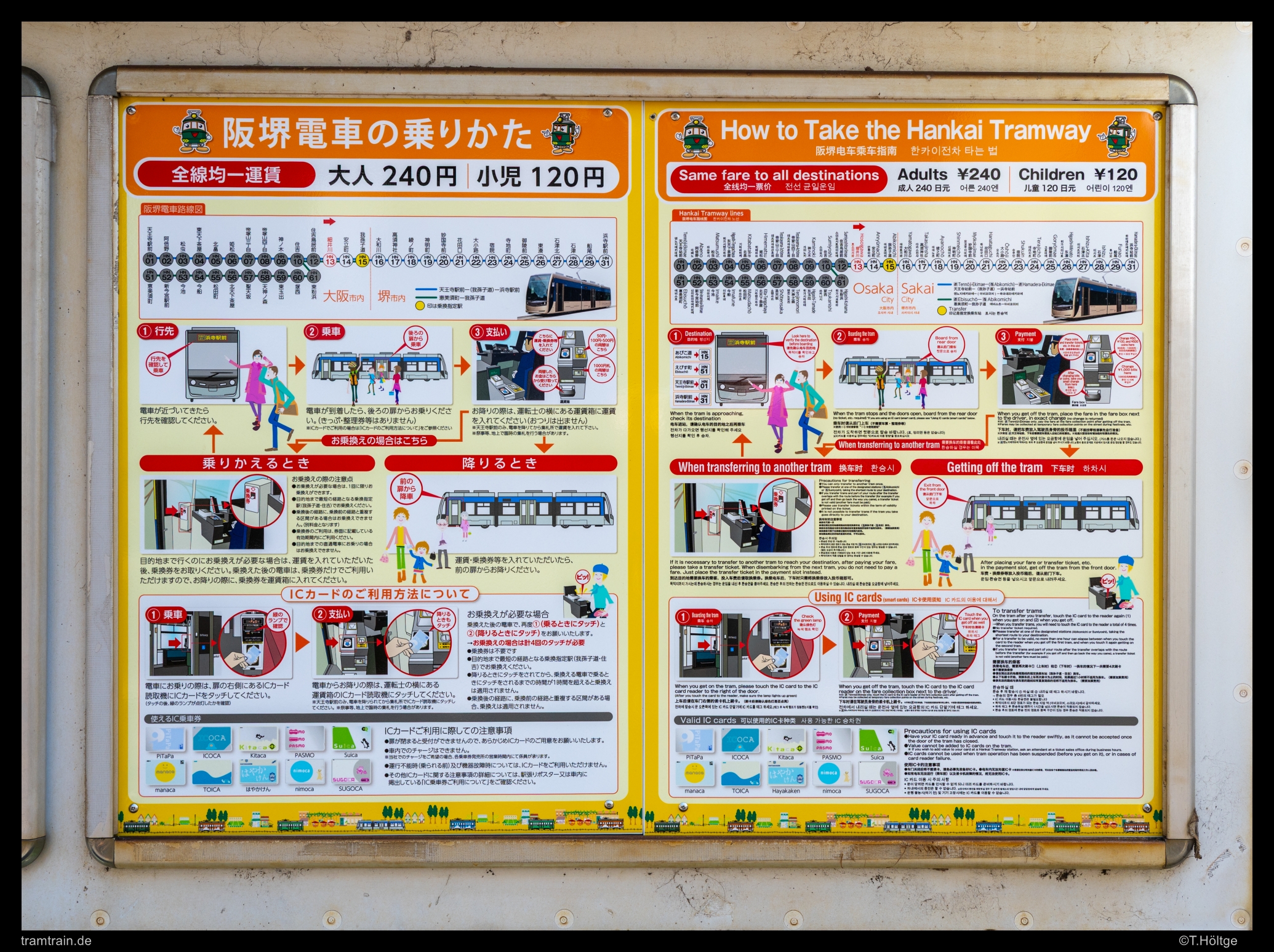 Beim kurzen Warten auf den nächsten Kurs gen Süden fällt der Blick auf die Hinweistafel für den Ein-/Ausstieg und Bezahlvorgang. Dank des Sumiyoshi-Taisha hat die Strecke auch eine große touristische Bedeutung, sodass sich die Anleitung sogar komplett auf Englisch findet. Interessanterweise wird hier ein Einheitstarif von 240 Yen gefahren. Viele andere Betreiber, gerade der längeren Straßenbahnlinien, haben einen über die gefahrene Distanz gestaffelten Tarif für Einzelfahrten.