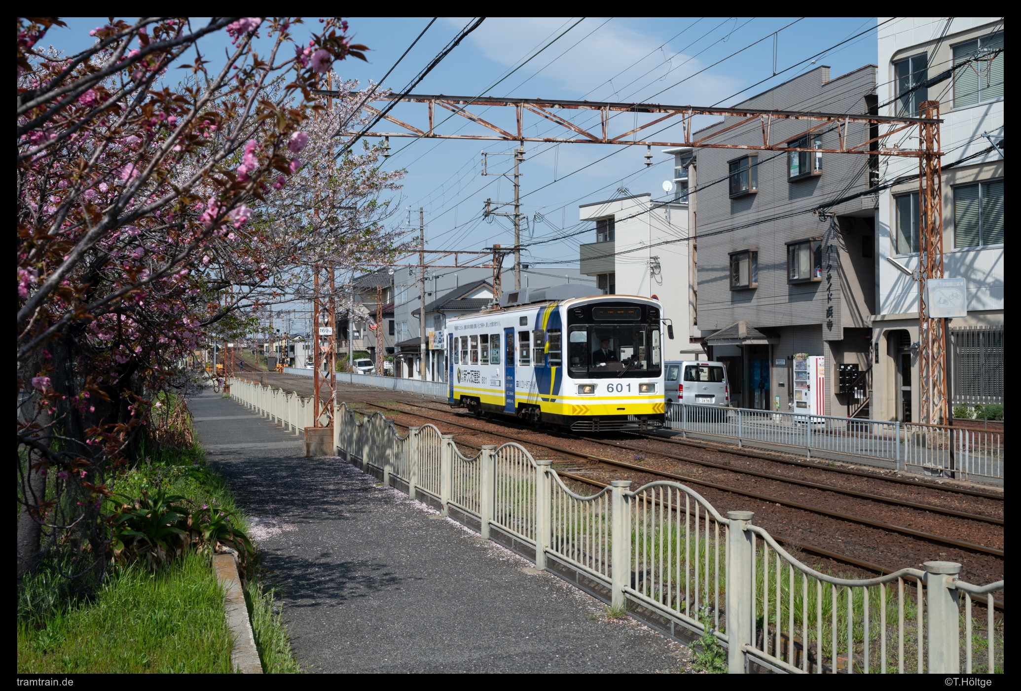 Wagen 601 auf den letzten Metern zur Endstation Hamaderaekimae. Der namensgebende Bahnhof Hamaderakōen an der Nankai Main Line, befindet sich von der Endstation hundert Meter die Straße runter.
