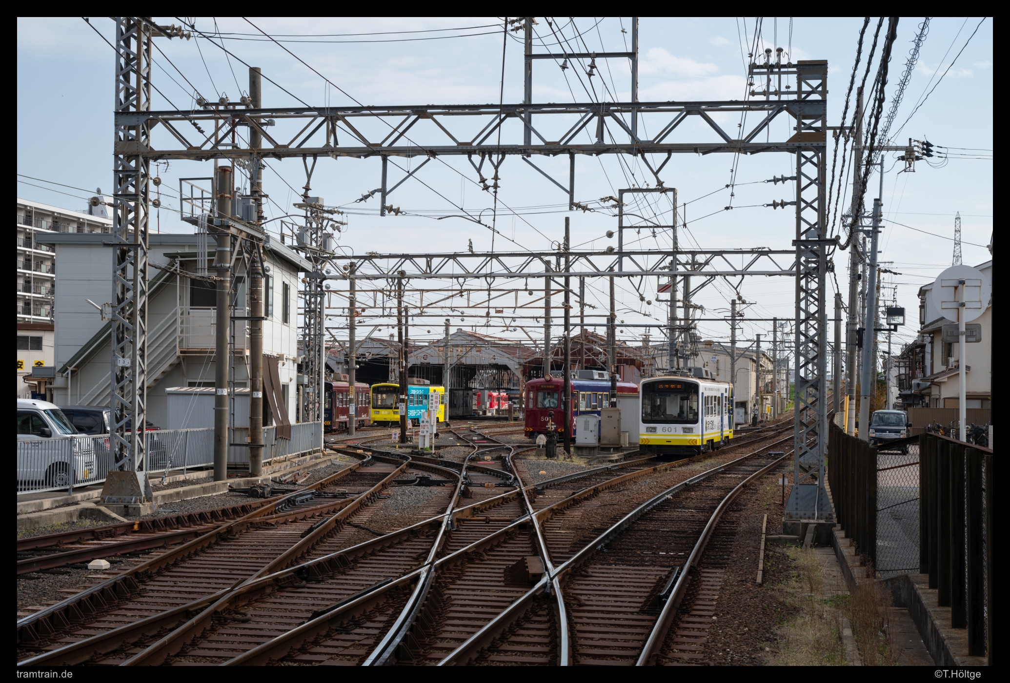 Beim Schuss dem Wagen 601 hinterher fällt der Blick auf die Abstellanlagen und Wagenhallen der Hankai Electric Tramway. Wagen 501 bereitet sich gerade zum Ausrücken vor.