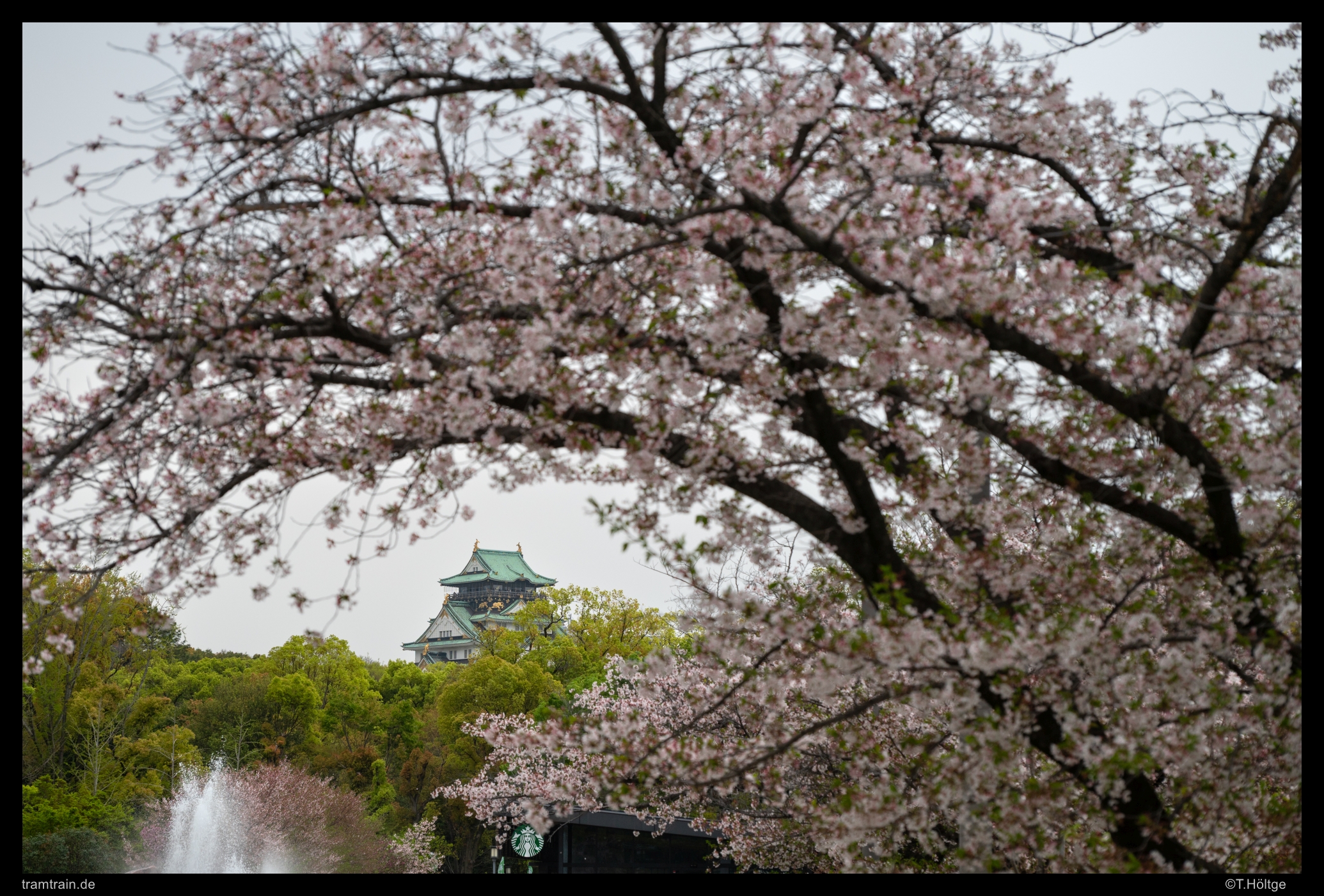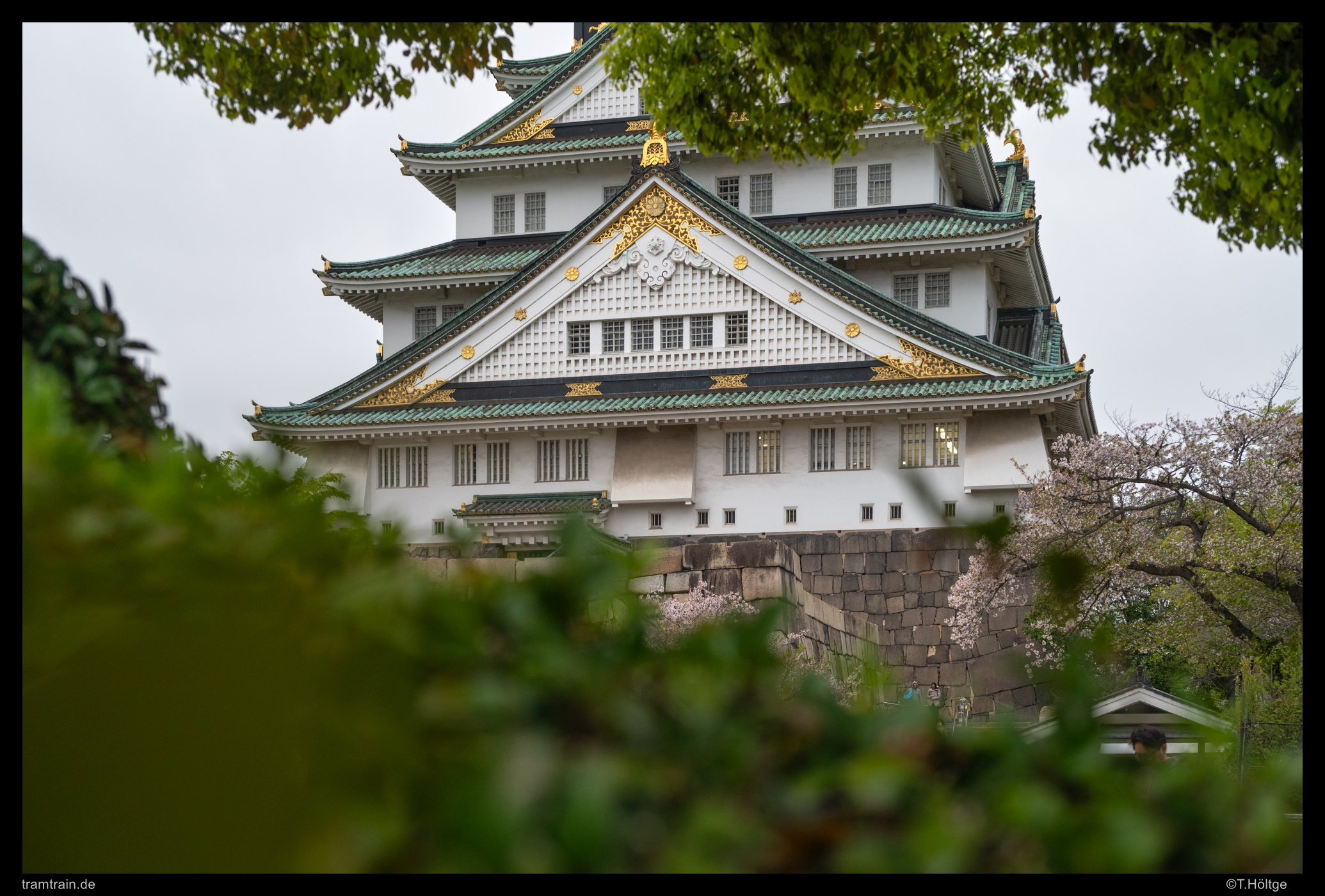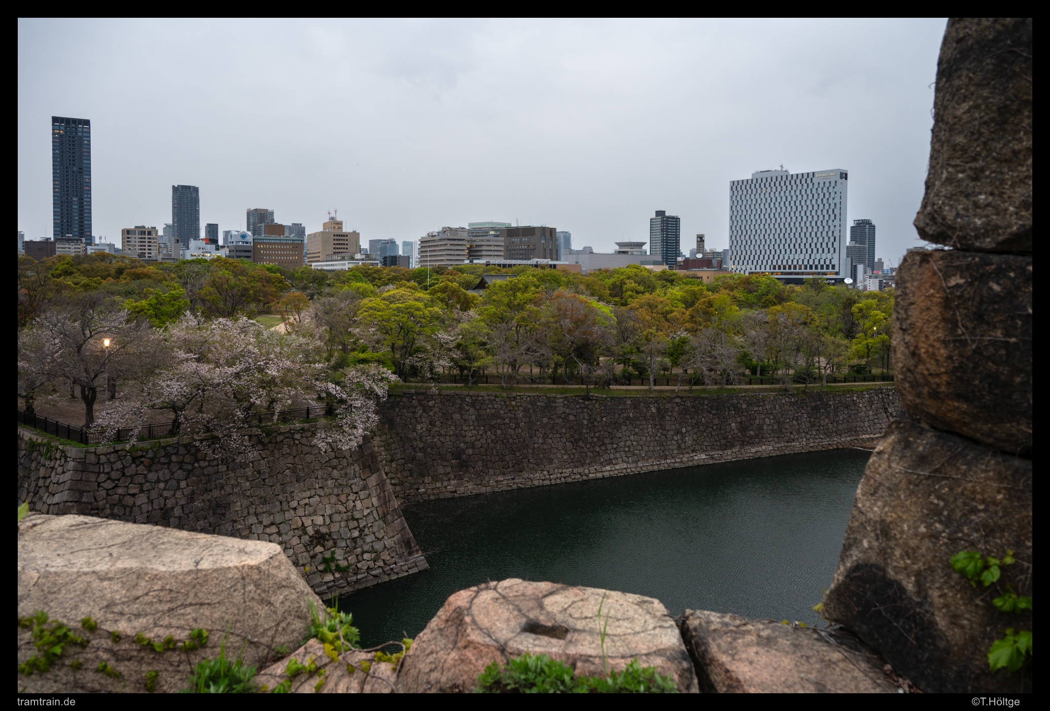 Aus weiter entfernten Perspektiven versinkt das Ōsaka Castle meist hinter den danebenstehenden Bäumen. Vermutlich hilft da nur Höhe.