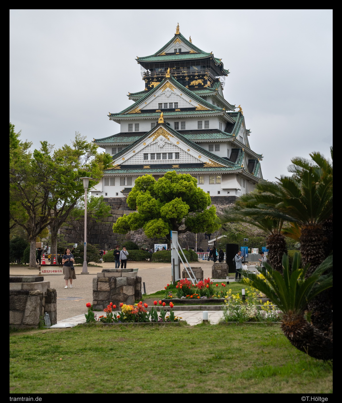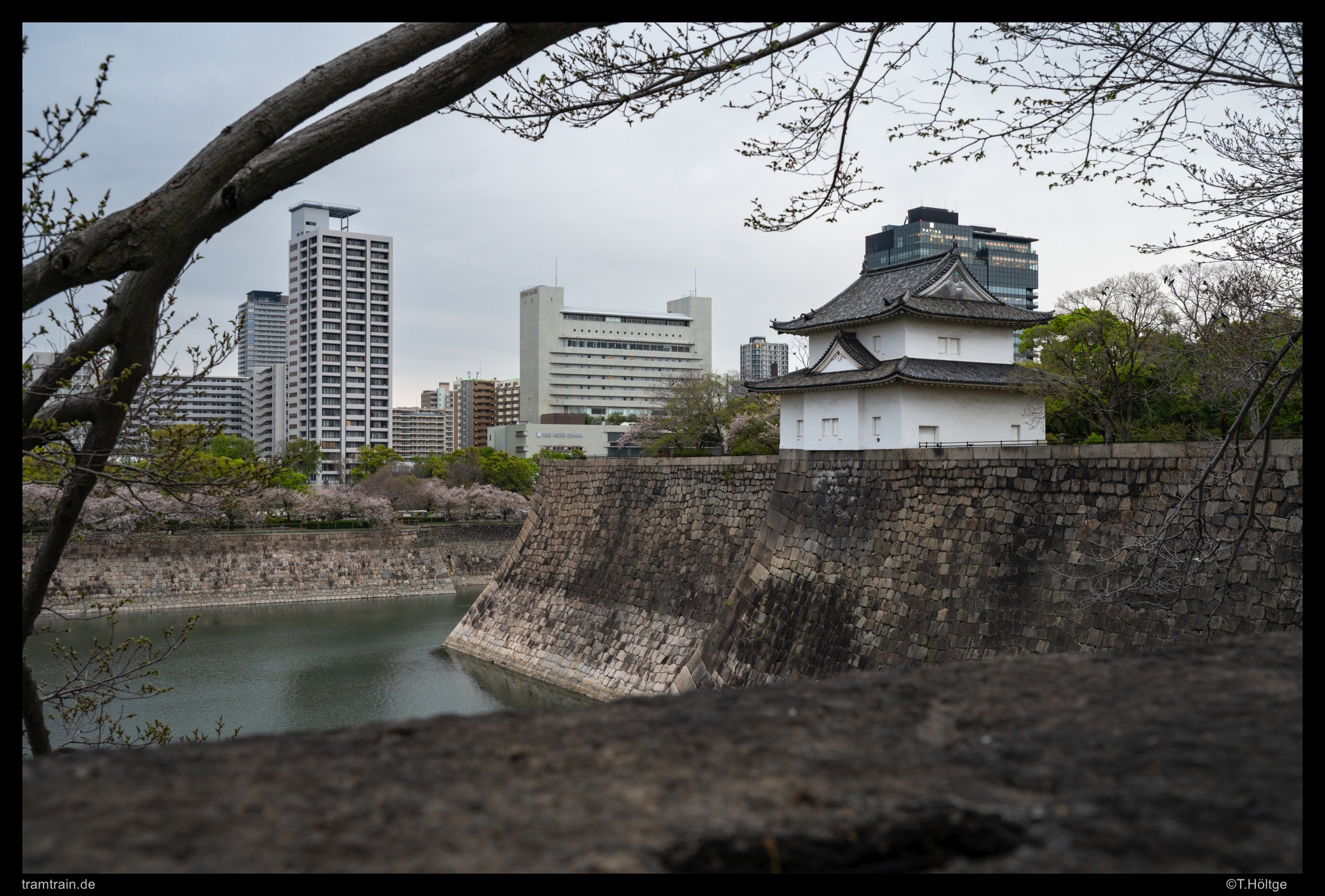 Über einen Damm gelangt man über den nicht gefluteten, südlichen Teil des inneren Grabens durch das Haupttor in den großen Innenhof der Burganlage. Ōsaka Castle stammt ursprünglich aus dem 16. Jahrhundert und wurde in seiner wechselvollen Geschichte mehrmals stark zerstört, unter anderem im Jahr 1868. Der heutige Hauptturm geht auf die erste Stahlbetonkonstruktion von 1931 zurück, die aber im 2. Weltkrieg erneut stark beschädigt wurde, als Ōsaka Castle als Militärbasis diente. Zuletzt wurde das Hauptgebäude in den 90er-Jahren an die Edo-era angelehnt, grundlegend rekonstruiert.