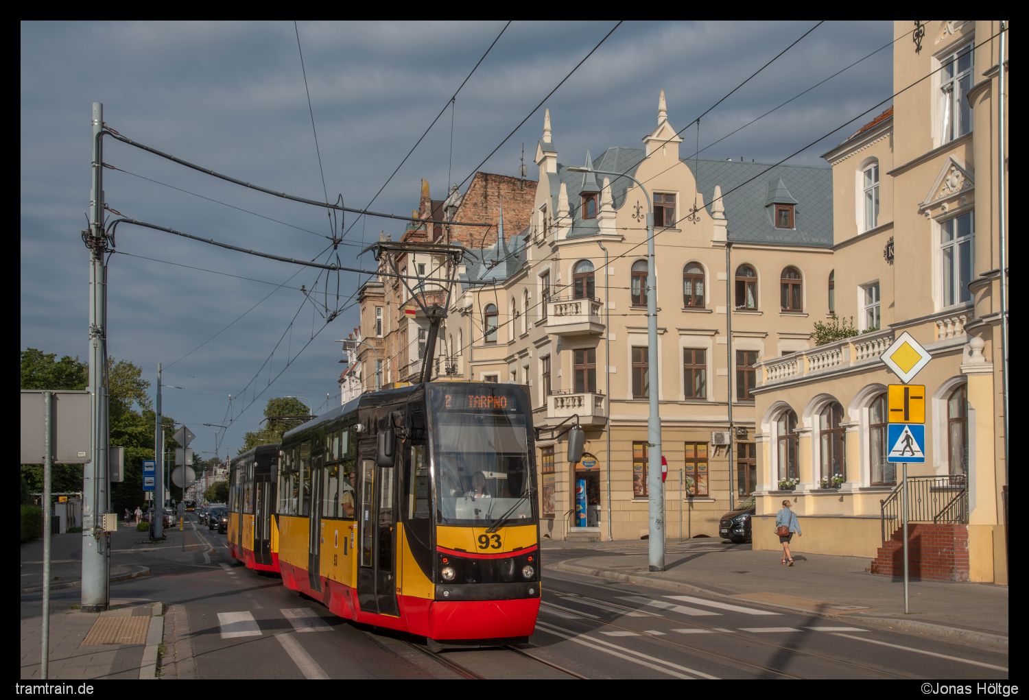 Für das erste Bild des Tages hatte sich die Sonne direkt mal gezeigt. Ein Blick in den Himmel verriet jedoch, dass es sich dabei wohl zunächst nur um einen kurzen Besuch handeln würde. Ich war nur ein paar Meter aus dem Apartment gelaufen, da kam das Konstal 805NaMM-Doppel 93+94 angefahren.