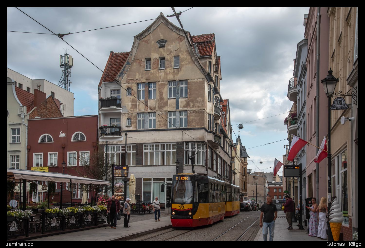 An der Station Rynek Główny durchquert die Straßenbahn für einen kurzen Moment die Innenstadt von Graudenz. Die Sonne hatte sich inzwischen hinter eine Wolkendecke zurückgezogen, sodass es an der Station relativ dunkel war. Trotzdem versuchte ich mich an einer ersten Umsetzung des Bildes mit Innenstadtkulisse. Es war wieder das Doppel 93+94, welches bereits von der Endstation zurückkehrte und in der Folge meine Mitfahrgelegenheit darstellte.