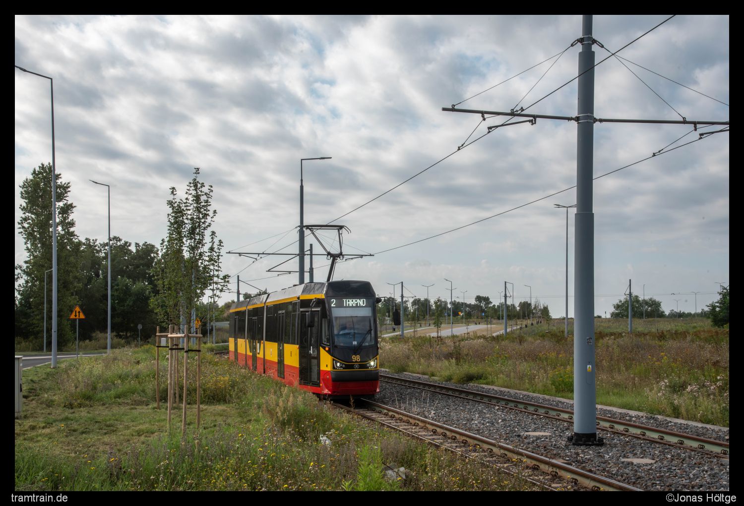 Jetzt wollte ich auch das gesamte Netz erkundet haben. Dafür fehlte mir noch das kurze Stück von der Station Legionów/Biblioteka bis zur Endstation Tarpno. Da die Gegenbahn auch gerade durchgefahren war, blieb mir nichts anderes übrig, als mich zu Fuß auf den Weg zur Endstation zu machen. Während ich mich bis zur Endstation vor arbeitete, gelang mir noch ein Bild eines entgegenkommenden Kurses. An der Endstation angekommen, hielt sich meine Begeisterung in Grenzen. Weder war die Endstation sonderlich schön, noch gab es irgendwo noch einen kleinen Sonnenspot, aus dem ich hätte ein Motiv umsetzen können. Ich wollte meine Suche nach Motiven aber noch nicht aufgeben. Da der Himmel inzwischen fast vollständig blau war und es auch noch etwas Zeit hätte, bis die Sonne untergehen sollte, wollte ich nach weiteren Motiven suchen. Im Kopf fuhr ich einmal die Strecke ab. Die Innenstadt versank langsam aber sicher völlig im Schatten. Alle Stellen, die da noch Sonne bieten würden, hatte ich bereits abgearbeitet. Das darauffolgende Stück entlang der langen Straße war weder schön, noch stand die Sonne dort richtig. Blieb mir nur noch das letzte Stück bis zur Endstation. Dort hatte ich relativ weitläufige Flächen um die Strecke herum in Erinnerung und die Sonne sollte auch richtig stehen. Dort wollte ich mein Glück versuchen.