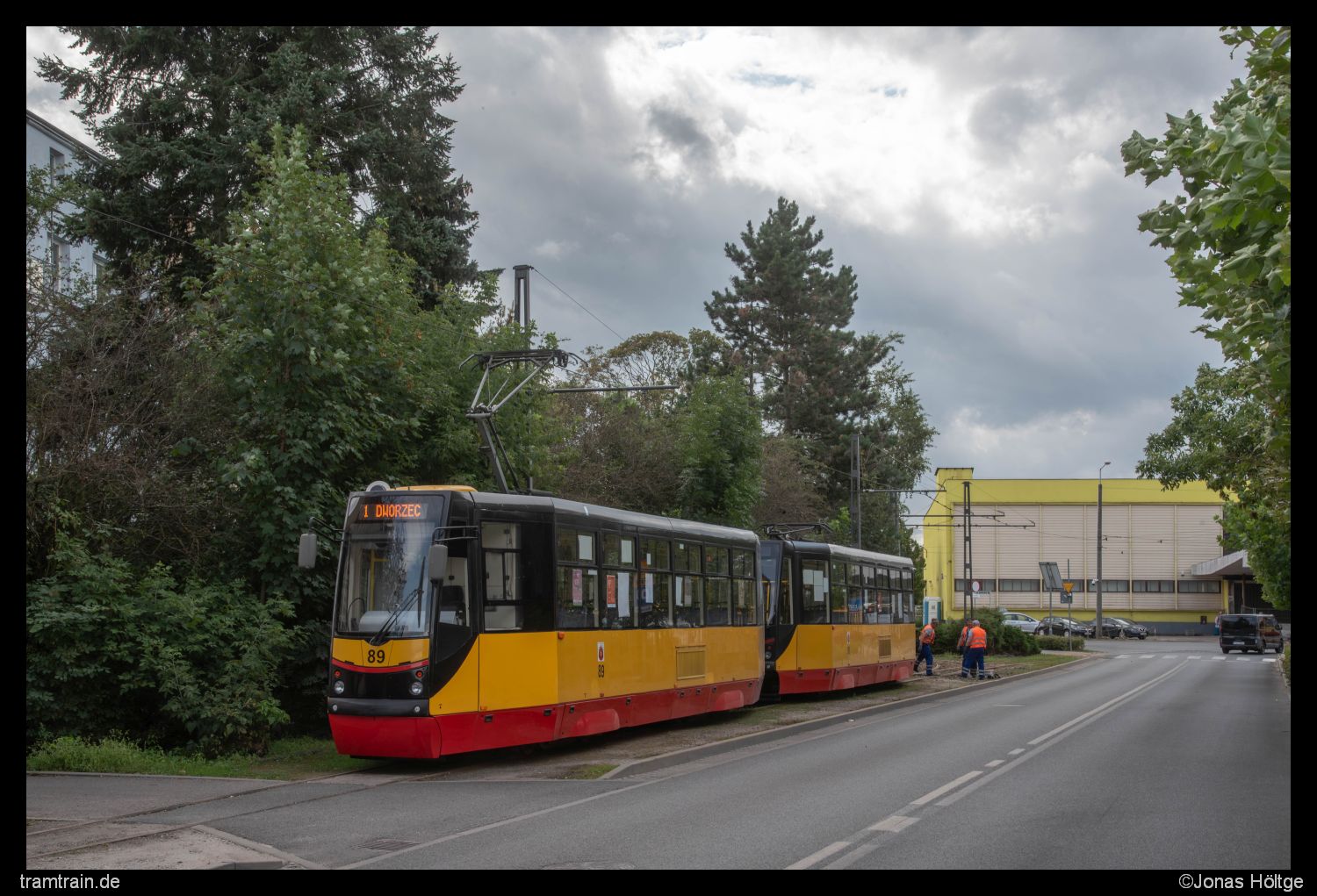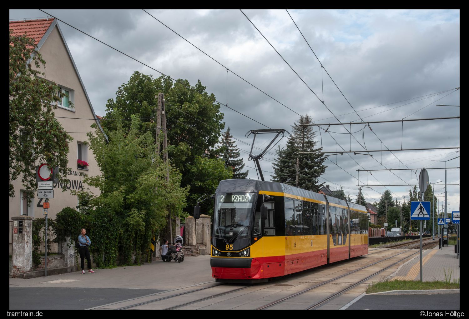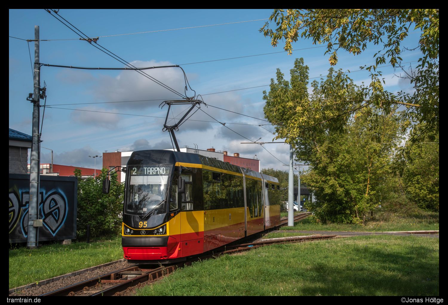 Inzwischen hatte ich mich bis zur Station Chełmińska/Tytoniowa vorgearbeitet. Hier kam mir der zweite neue Wagen in Form von Wagen 95 entgegen. An der Station ergab sich für die Straßenkreuzung eine kurze Lücke im Zaun und auch die Umgebung der Station bot ein wenig mehr Abwechslung als der Rest der Strecke, sodass das Bild nicht ganz so nichtssagend war, wie das letzte.