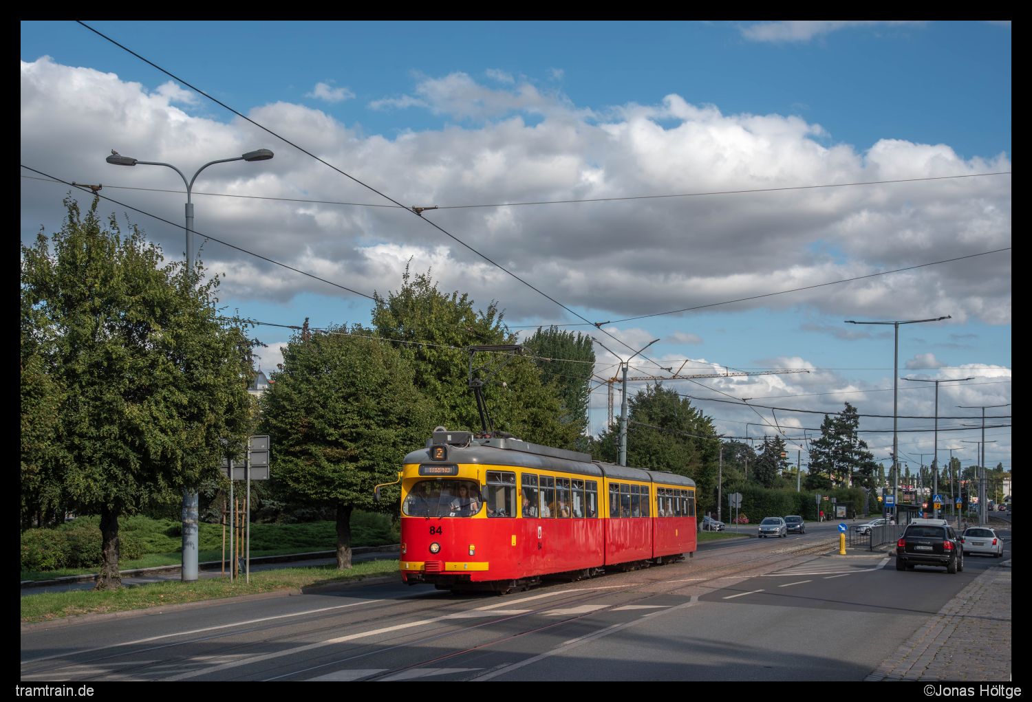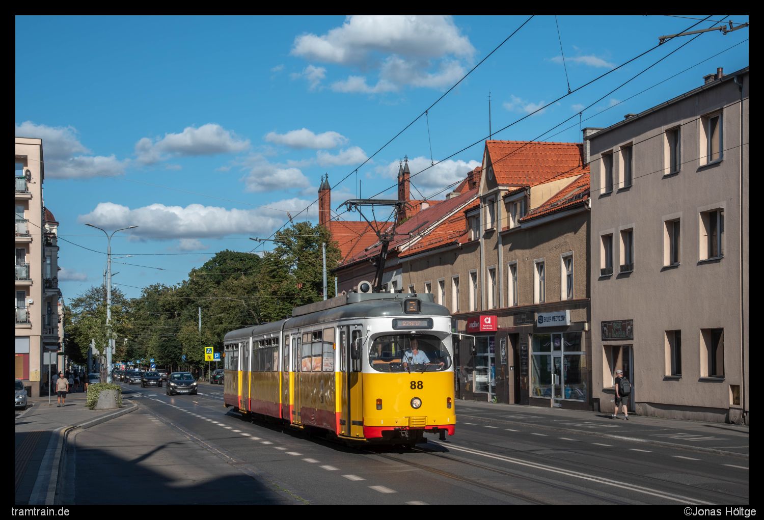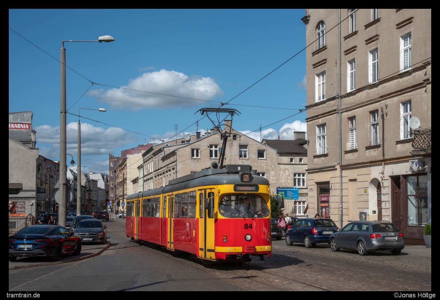 Ich hatte die schwierigsten Stunden des Tages hinter mir. Langsam kam der Planverkehr wieder ins Rollen und die Abstände zwischen den Bahnen näherten sich wieder einer Regelmäßigkeit an. Zudem lockerte die zuvor dichte Wolkendecke immer mehr auf, sodass sich wieder größere blaue Stellen zwischen den Wolken zeigten. Es war zwar schon 15 Uhr und so unglaublich viel Zeit würde mir nicht mehr bleiben, nun war ich aber motiviert noch einige schöne Sonnenbilder vom Betrieb umzusetzen. Hier draußen hatte ich jetzt alles umgesetzt. Die Motive würden bei Sonne sowieso nur bedingt schöner werden. Daher entschied ich mich dazu, mich wieder etwas mehr in Richtung Innenstadt zu orientieren. Passend kam aus der anderen Richtung Wagen 88 zurück und ich fuhr mit dem Wagen bis zur Station Chełmińska/Włodka. Da der Duewag 84 genau einen Kurs vor Wagen 88 war, hatte ich jetzt direkt zwei Chancen auf Duewag-Bilder in der Sonne. Nach den beiden Bildern der Wagen hielt ich mich noch eine Weile weiter in der Innenstadt auf und lichtete die Wagen auch auf dem Weg in die andere Richtung noch einmal ab. In der Innenstadt traf ich zudem auf einen weiteren deutschen Fotografen, mit dem ich mich über die Unregelmäßigkeiten im Takt unterhielt. Er hatte aber auch nicht mehr Informationen als ich, wieso es zum zwischenzeitlichen Zusammenbruch gekommen war. So entstanden in den nächsten 1½ Stunden endlich regelmäßige Sonnenbilder.