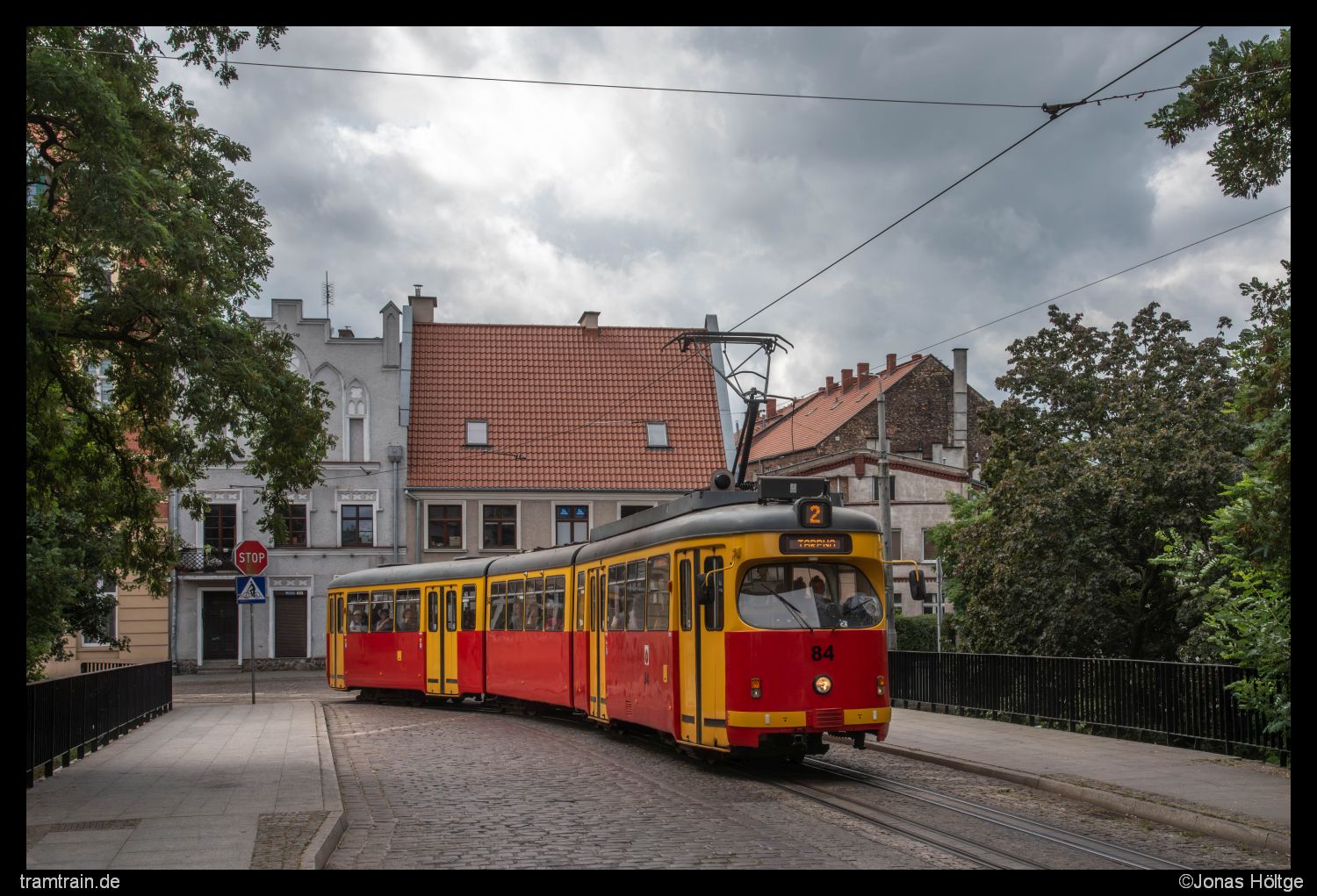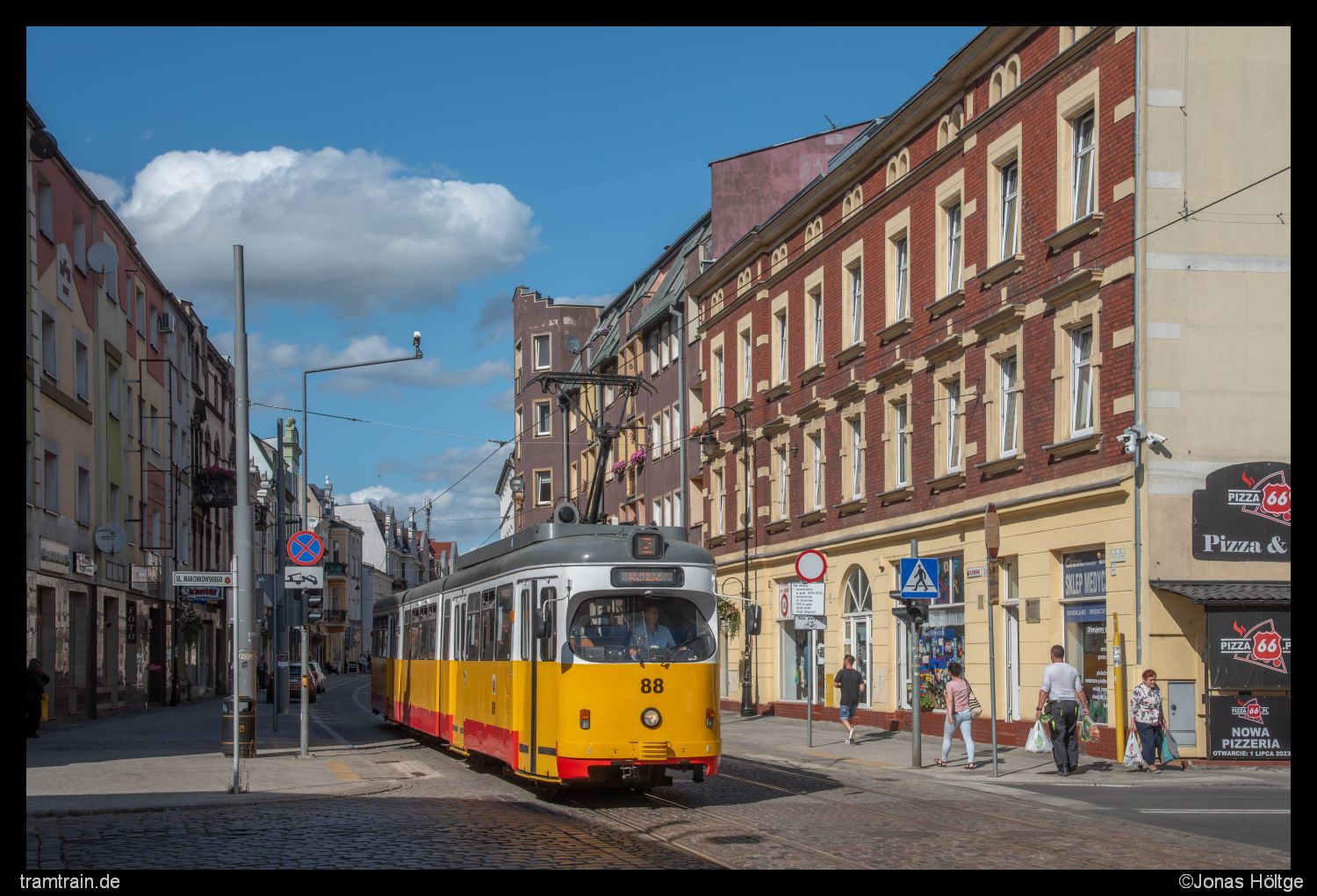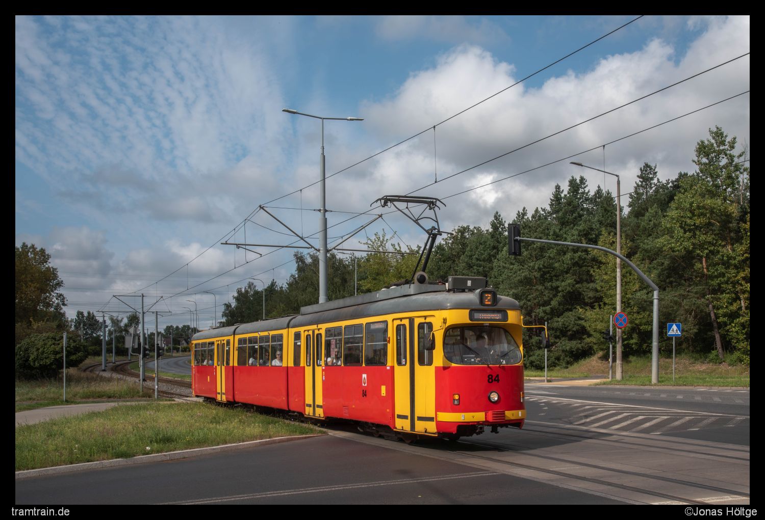 Ich hatte die schwierigsten Stunden des Tages hinter mir. Langsam kam der Planverkehr wieder ins Rollen und die Abstände zwischen den Bahnen näherten sich wieder einer Regelmäßigkeit an. Zudem lockerte die zuvor dichte Wolkendecke immer mehr auf, sodass sich wieder größere blaue Stellen zwischen den Wolken zeigten. Es war zwar schon 15 Uhr und so unglaublich viel Zeit würde mir nicht mehr bleiben, nun war ich aber motiviert noch einige schöne Sonnenbilder vom Betrieb umzusetzen. Hier draußen hatte ich jetzt alles umgesetzt. Die Motive würden bei Sonne sowieso nur bedingt schöner werden. Daher entschied ich mich dazu, mich wieder etwas mehr in Richtung Innenstadt zu orientieren. Passend kam aus der anderen Richtung Wagen 88 zurück und ich fuhr mit dem Wagen bis zur Station Chełmińska/Włodka. Da der Duewag 84 genau einen Kurs vor Wagen 88 war, hatte ich jetzt direkt zwei Chancen auf Duewag-Bilder in der Sonne. Nach den beiden Bildern der Wagen hielt ich mich noch eine Weile weiter in der Innenstadt auf und lichtete die Wagen auch auf dem Weg in die andere Richtung noch einmal ab. In der Innenstadt traf ich zudem auf einen weiteren deutschen Fotografen, mit dem ich mich über die Unregelmäßigkeiten im Takt unterhielt. Er hatte aber auch nicht mehr Informationen als ich, wieso es zum zwischenzeitlichen Zusammenbruch gekommen war. So entstanden in den nächsten 1½ Stunden endlich regelmäßige Sonnenbilder.