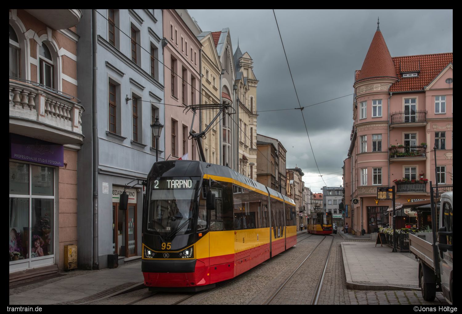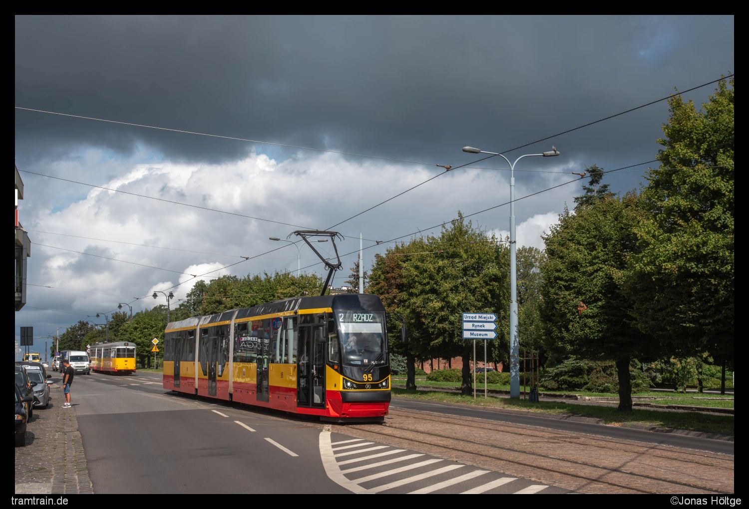 Die Wolken am Himmel wurden im Moment tendenziell eher dunkler. Für einen kurzen Moment schaffte es die Sonne aber hinter den Wolken hervor. Ich ergriff direkt die Chance, verließ den Wagen an der Station Al. 23 Stycznia und schoss ein Bild des entgegenkommenden Wagens 95. Zu meinem Glück passte der Sonnenstand hier gerade perfekt, sodass sich der Wagen im passenden Licht präsentierte. Im Hintergrund verschwand noch Duewag 88, mit dem ich bis eben gereist war.