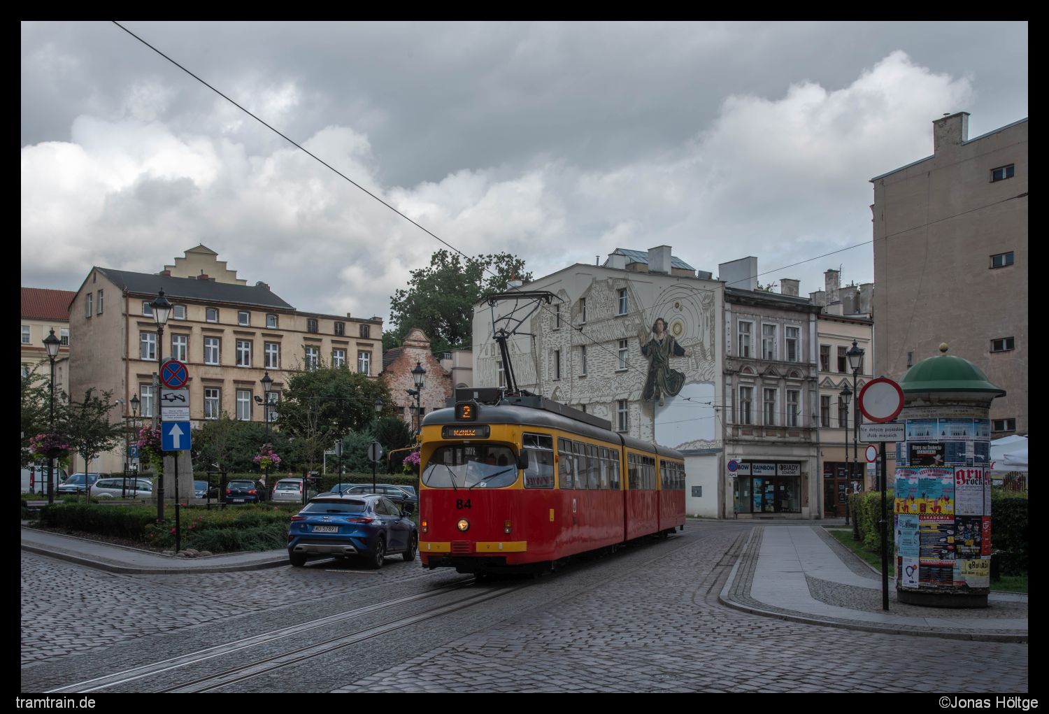 Für das Bild von Wagen 84 waren die Lichtverhältnisse dahingegen alles andere als optimal. Während ich auf den Wagen wartete, kämpfte die Sonne sich kurzzeitig etwas frei, sodass diese Stelle perfekt im Licht gewesen wäre. Als sich der Wagen jedoch anbahnte, ging das Licht komplett aus und dafür war der Himmel im Hintergrund extrem hell. So war Wagen 84 beim Bild relativ dunkel. Das kleine Stück nahe der Station Rynek Główny, an dem die beiden Fahrtrichtungsgleise ineinander verschlungen verliefen und eine schöne Wandmalerei im Hintergrund zu sehen war, wollte ich mir dennoch nicht entgehen lassen.