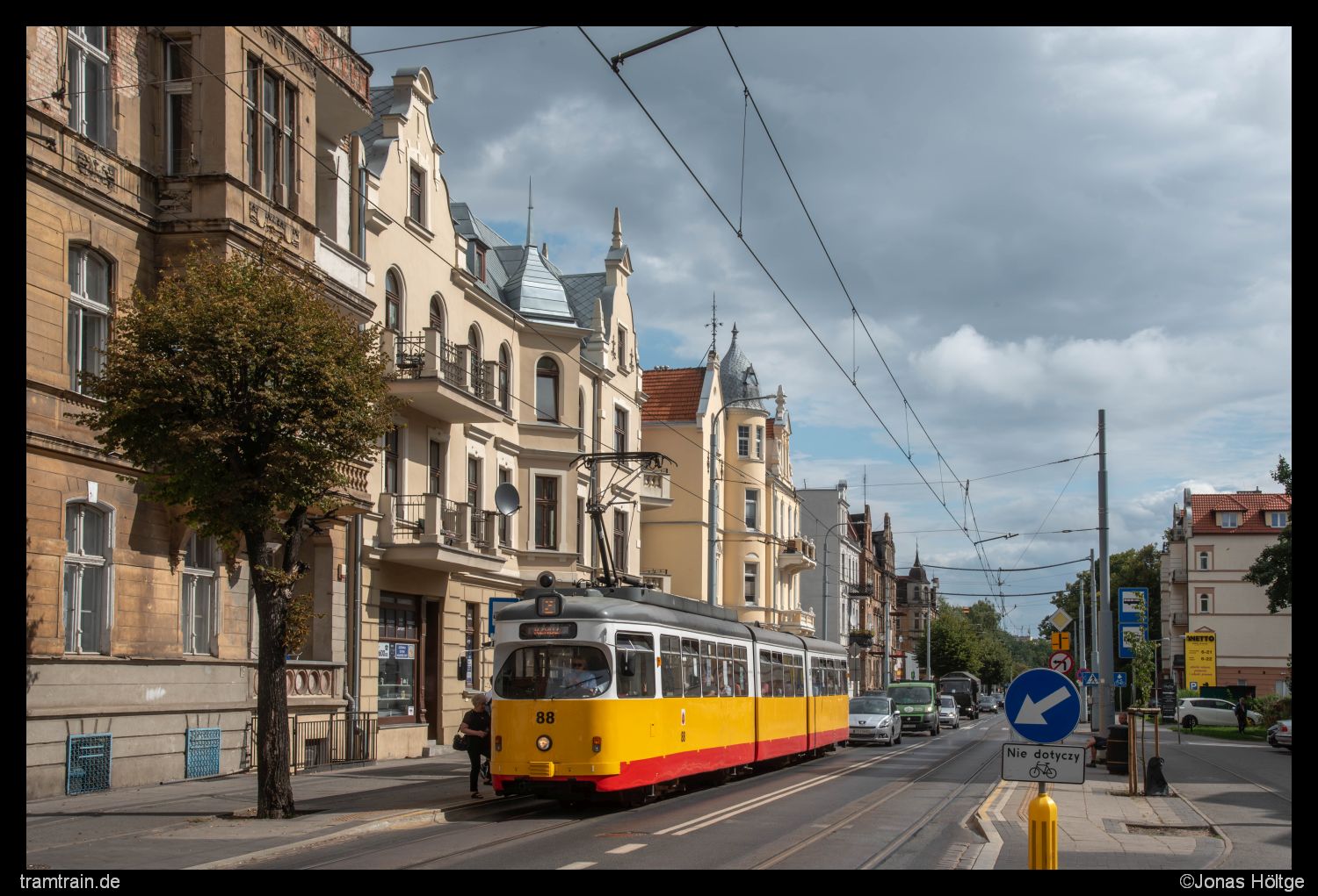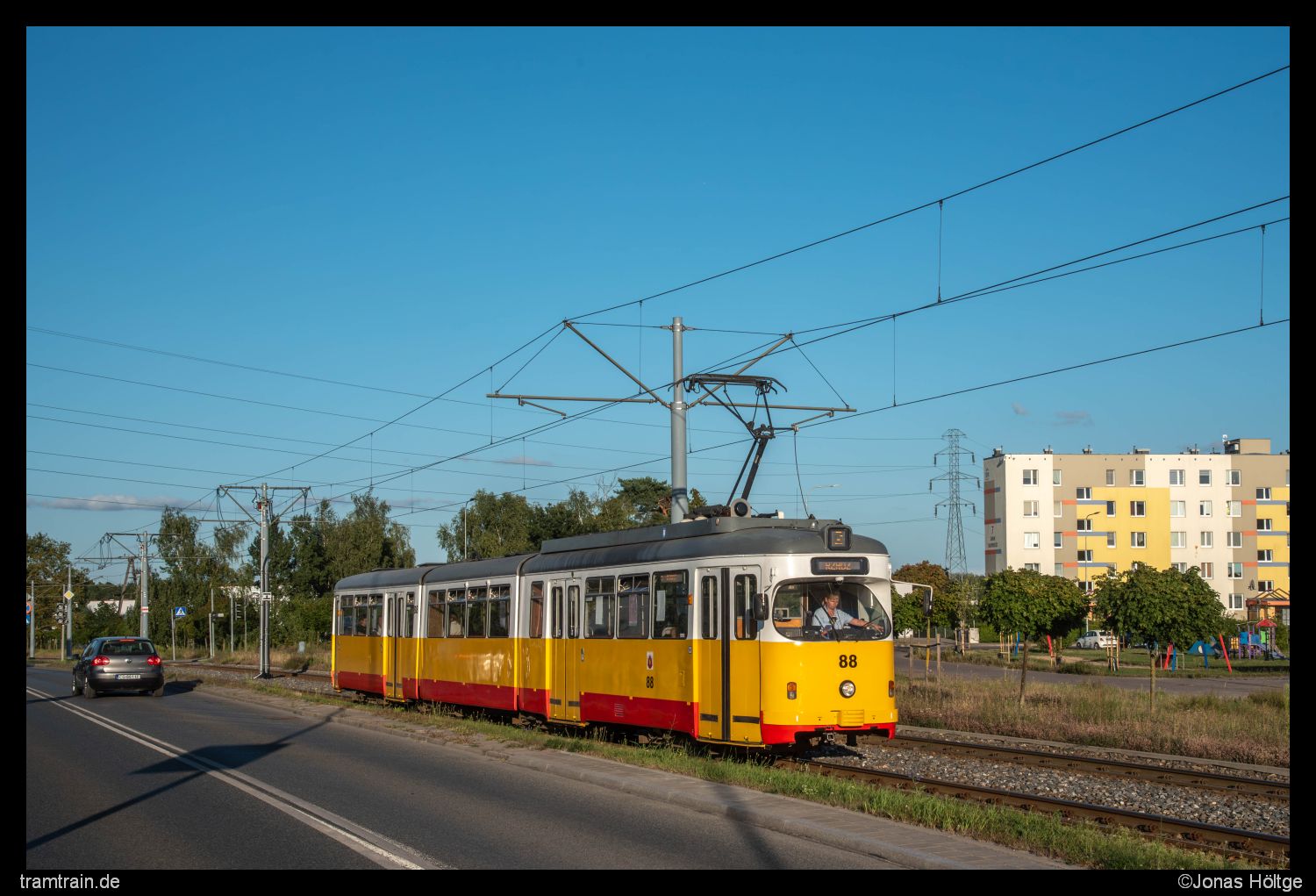 Ich hatte mich von der Station Chełmińska/Południowa aus zu Fuß weiter in Richtung der Station Konstytucji 3 Maja bewegt. Kurz bevor ich die Station erreichte, stellte ich mich für ein Motiv auf, in dem ich Duewag 88 ablichten wollte. Hier stand die Sonne am Abend perfekt. Die Hochhäuser, die sich auf meiner Seite der Straße befanden, waren so weit entfernt, dass sie schattentechnisch keine Rolle spielten. Einzig der Faktor der Autos blieb ein großes Risiko. Der im Hintergrund zu sehende Golf hatte auch alles dafür gegeben, mir das Bild zu zerstören, durch eine Reihenauslösung entstand aber ein passendes Bild, in dem der Golf nicht wirklich störte.