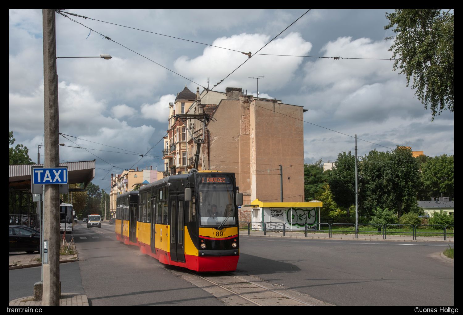 Nach dem Bild ging ich zu Fuß die Strecke weiter entlang. Noch etwas 100 Meter ging die Strecke in Seitenlage zur Straße weiter, bevor sie in Mittellage schwenkte und als wirkliche Straßenbahn verkehrte. Die Umgebung und auch der Streckenverlauf wurden nun ein wenig interessanter, was nach dem vorherigen Streckenverlauf jedoch auch keine Kunst war. Nur wenige Meter nachdem die Strecke in Straßenmitte geschwenkt war, blieb ich stehen, da ich eine ganz hübsche Stelle gefunden hatte. Zudem müsste sowieso demnächst der nächste Kurs stadteinwärts durchkommen. Also stellte ich mich an den Straßenrand und wartete ab. Tatsächlich dauerte es nicht lange, bis sich in weiter Entfernung eine Bahn näherte. Ich guckte nochmal schnell etwas auf dem Handy nach, bevor die Bahn bei mir sein sollte. Als ich wieder hochguckte, war der Wagen aber immer noch nicht nähergekommen. Vielleicht hatte er aber auch gerade an einer Station gehalten und würde gleich wieder losfahren. Ich beobachtete das ganze weiter und guckte auch mal in die andere Richtung die Strecke herunter, wo eigentlich auch wieder ein Kurs dran war. Dort war jedoch nichts zu sehen. Noch immer bewegte sich der Wagen nicht weiter und langsam wurde mir klar, dass es sich um eine Störung handeln musste. Einige Zeit wartete ich noch ab, der Wagen kam aber nicht näher und daher entschied ich mich irgendwann zu Fuß die Strecke in Richtung Innenstadt zu laufen. Etwas anderes blieb mir ja jetzt nicht über. An der nächsten Station versuchte ich mir etwas mehr Informationen zu verschaffen. Auf der Anzeigetafel der Haltestelle lief ein Text durch, der offensichtlich Aufschluss über die Situation geben sollte. Da ich jedoch kein Wort polnisch verstand und auch kein Bild mit dem Übersetzer von einem durchlaufenden Text auf der Anzeigetafel schießen konnte, musste ich jedes Wort mühsam einzeln abtippen. Als Ergebnis kam nur heraus, dass die Bahn aufgrund einer technischen Störung auf unbestimmte Zeit ausfallen würde und man sich bei den Fahrgästen für die Unannehmlichkeiten entschuldige.