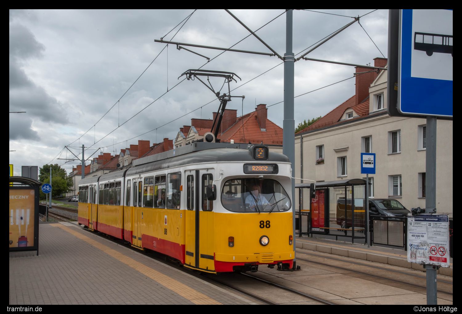 An der Station Chełmińska/Jackowskiego bot sich direkt die nächste Möglichkeit auf ein Bild von Wagen 88. Die Fahrerin hatte gerade den Fahrgastwechsel abgeschlossen und lächelte mich in der Folge freundlich an. Die von der üblichen Lackierung abweichende Lackierung brachte durchaus nochmal etwas mehr Abwechslung in den Wagenauslauf.
