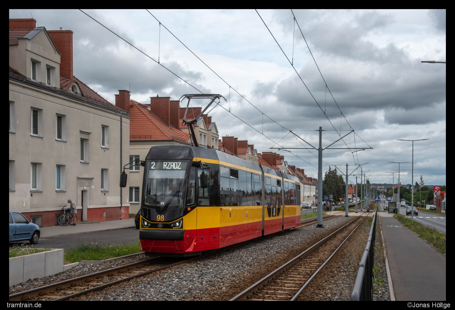 Für den entgegenkommenden Wagen 98 hatte ich mich etwas von der Station entfernt. Dieses Bild beschrieb sehr gut den gesamten Streckenverlauf an der Straße entlang. Links neben der Strecke zogen sich eine Reihe an gleich aussehenden Häusern in einer tristen Farbe entlang, während die Strecke sonst von Zäunen begleitet wurde. Wagen 98 war dabei schon fast der Punkt des Bildes, der am meisten Farbe zu bieten hatte.