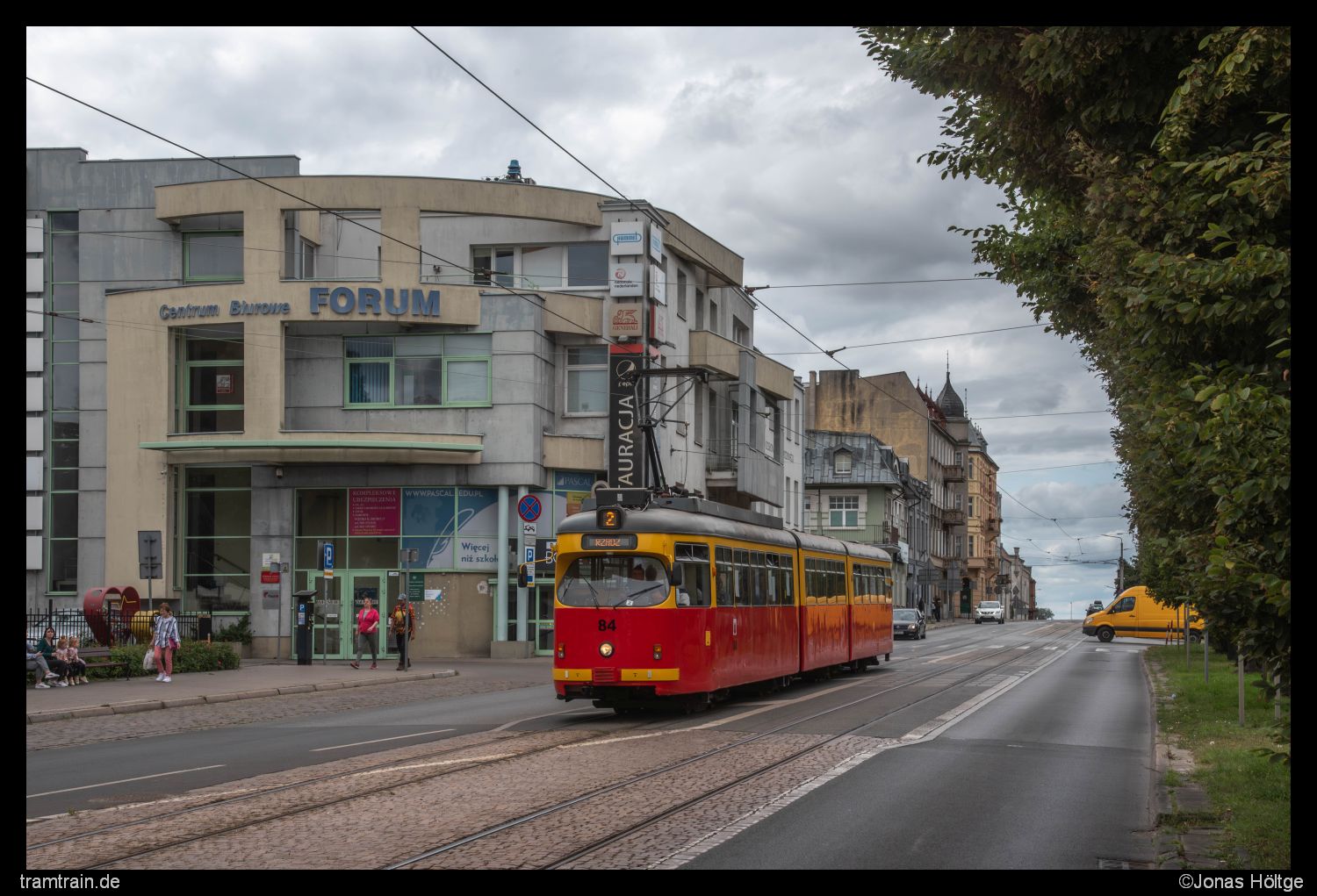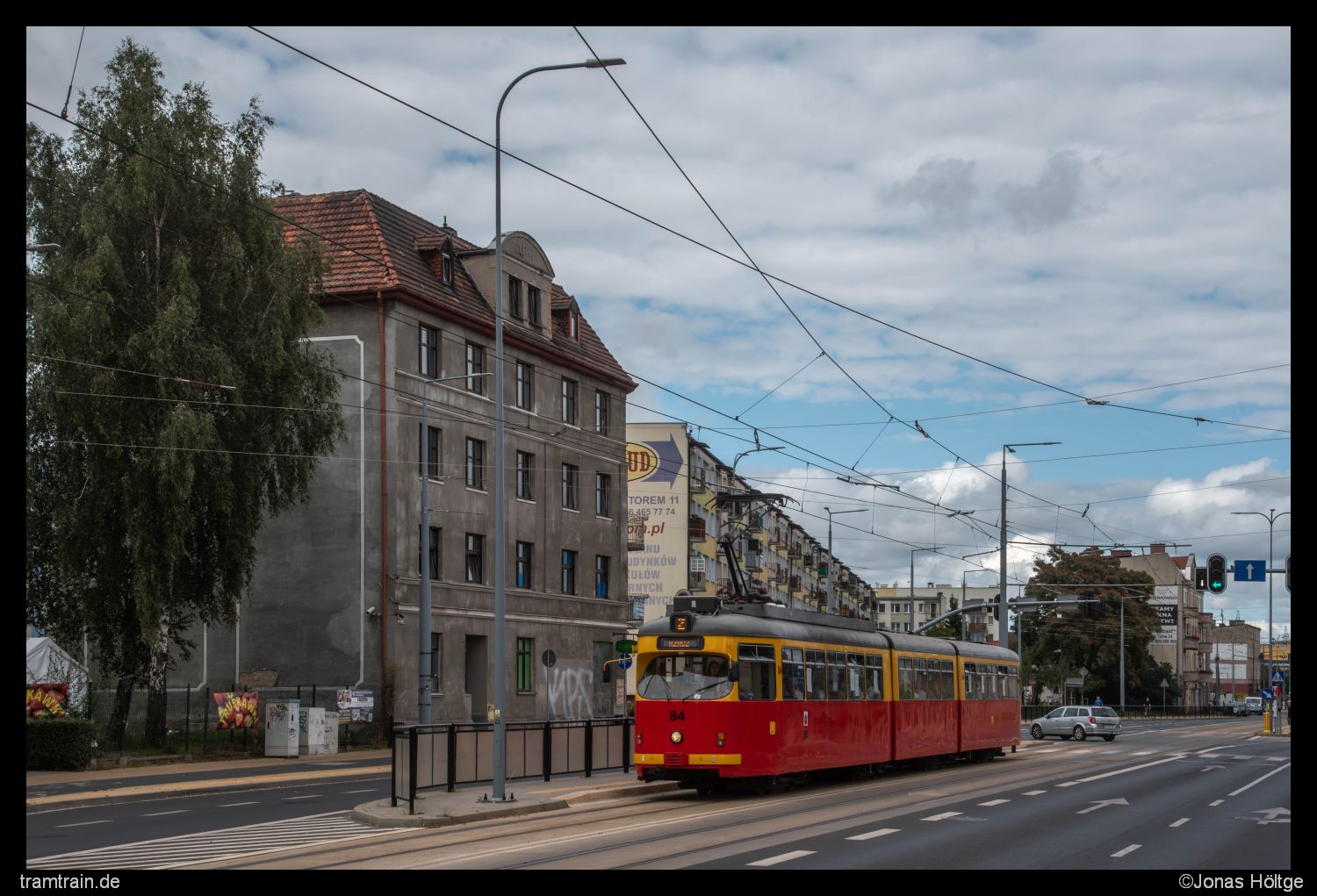 Duewag 84 war der erste Wagen, der mir nach der Betriebsstörung wieder fahrend begegnete. Hier gelang mir ein Bild des Wagens kurz vor der Station Al. 23 Stycznia. Die Farbe der Häuser passte hier hervorragend zur Farbe des Himmels. Grau in Grau mit dem einzigen wirklichen Farbstich durch den Wagen selbst.