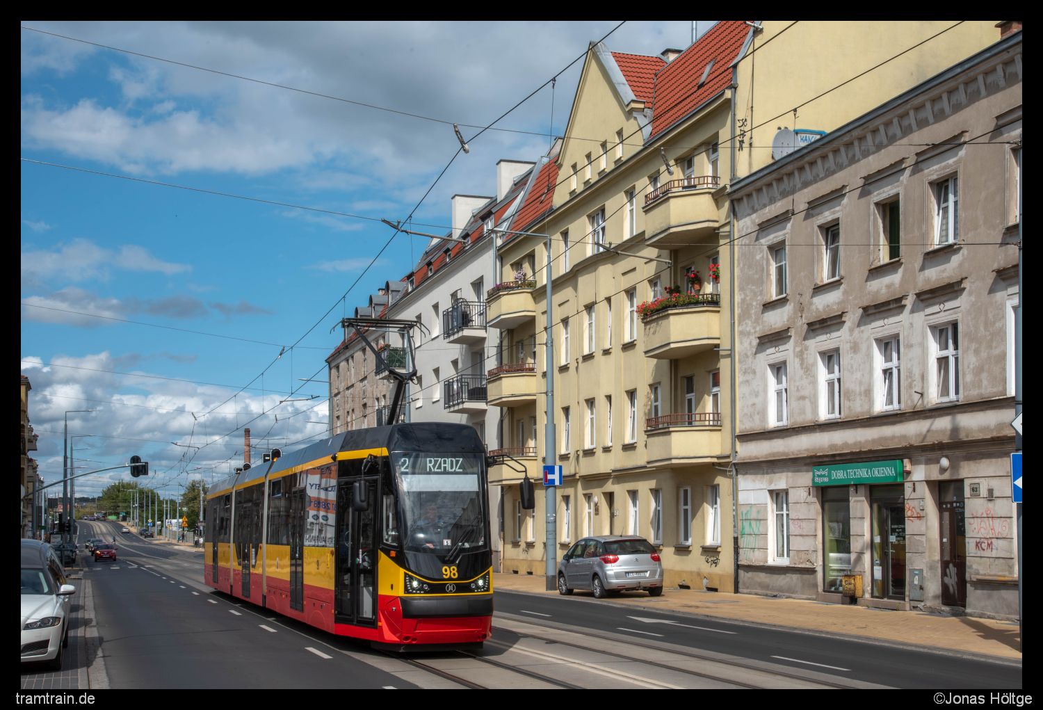 Kurz vor der Station Chełmińska/Piaskowa hatte ich endlich mal ein Haus gefunden, was zumindest so etwas ähnliches wie Farbe hatte. Gepaart mit dem einen Balkon mit vielen Blumen ergab sich hier ein ganz hübsches Bild. Das Problem war nur, dass jetzt ewig nichts kam. Zwischendurch hatte ich mir in einem Zabka am Straßenrand mein Mittagessen geholt. Dann endlich kam das Doppel 93+94 nach über 20 Minuten Pause, welches jedoch im Schatten versank. Nur zehn Minuten später folgte Modertrans 98 in der Sonne.