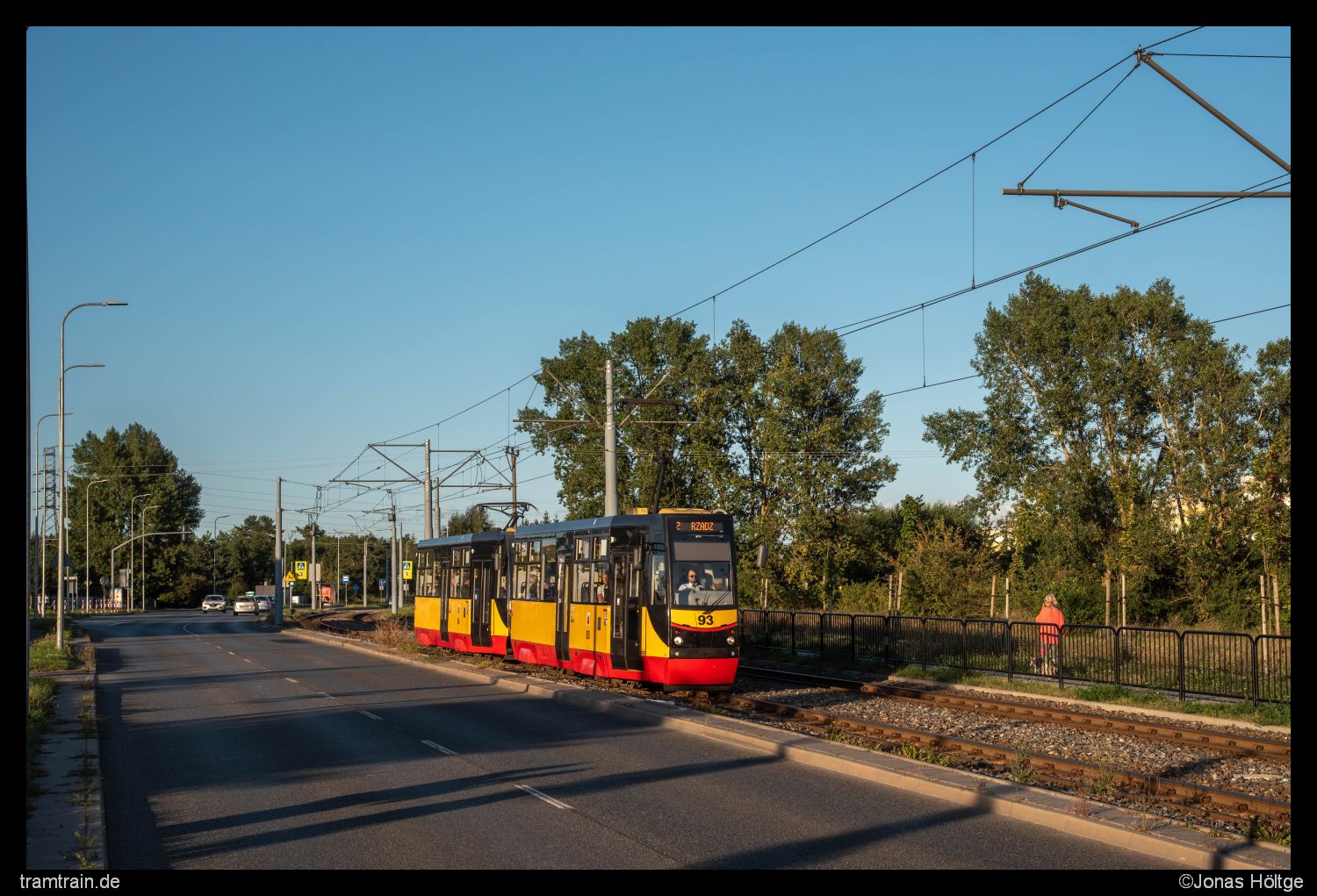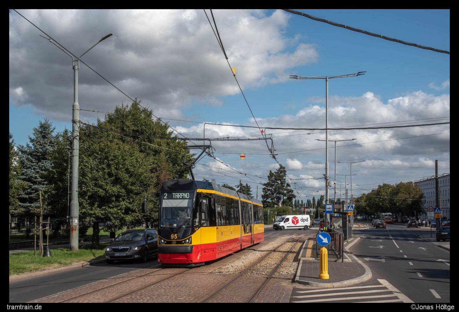 Ein wenig schwierig war es inzwischen schon, noch genug sonnige Stellen zu finden. So verschob sich das Problem am heutigen Nachmittag von fehlender Sonne auf fehlende Sonnenspots bei vorhandener Sonne. Die Station Al. 23 Stycznia war nicht von höheren Gebäuden umgeben, sodass sich hier das Problem des Schattens nicht auftat. Dafür fuhren parallel zu Wagen 95 auch einige Autos die Straße entlang, von denen sich aber die meisten hinter der Bahn versteckten.