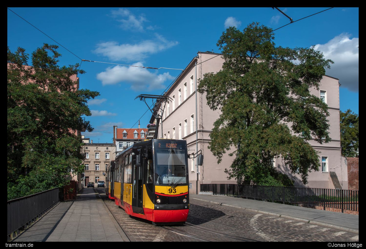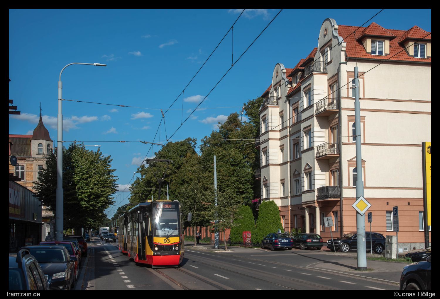 Kurz vor Erreichen der Endstation kam mir das Doppel 93+94 entgegen. Glücklicherweise erwischte ich das Doppel noch hier, denn die folgenden Meter bis zur Endstation boten sich keine Lücken mehr zwischen den Baumschatten, die lang genug gewesen wären. Kurz darauf erreichte das Doppel die Station Legionów/Biblioteka.