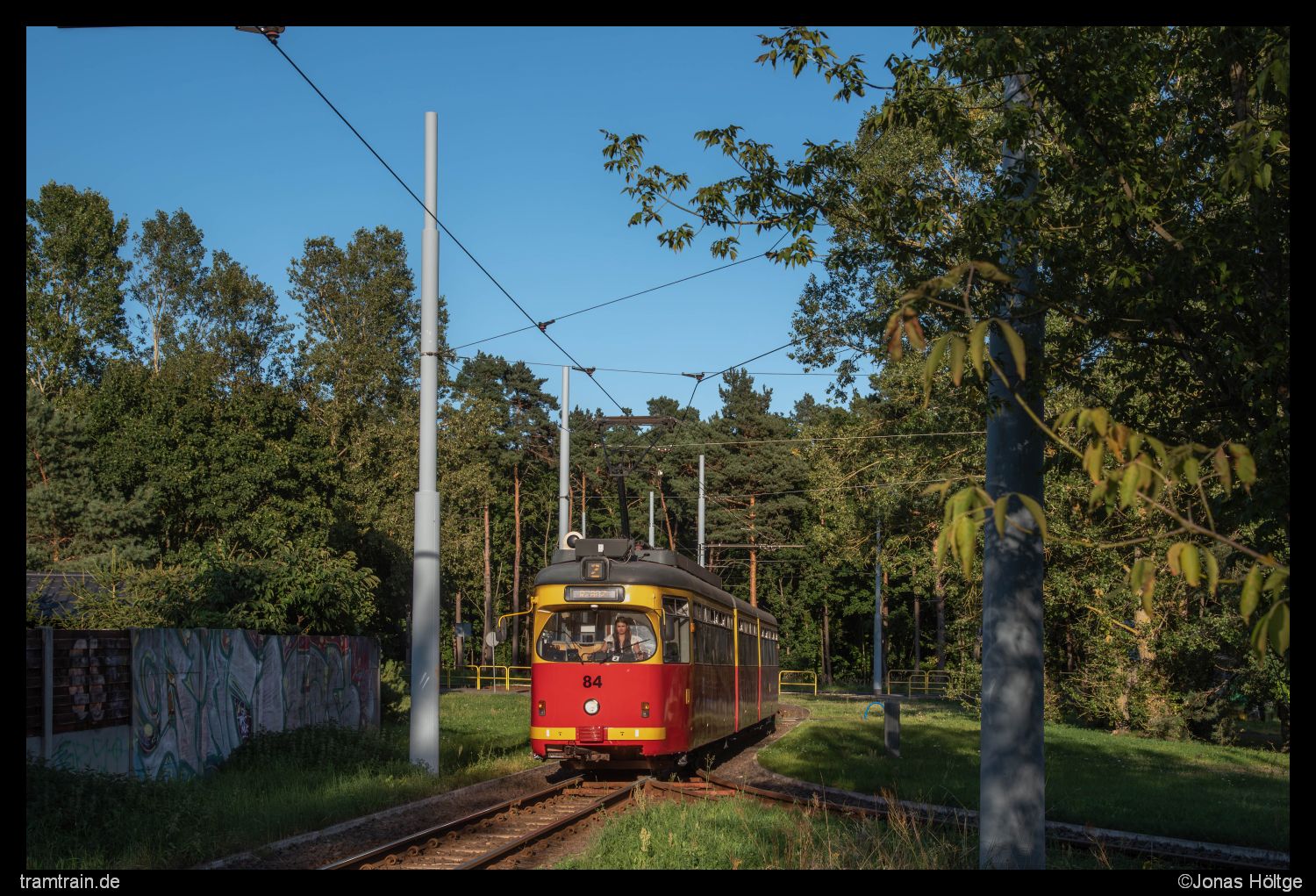 Das Licht stand bei der Zwischenschleife an der Station Chełmińska/Południowa fast exakt in der Gleisachse. Da aber auch mein Bild relativ steil entstand, störte dieser Umstand nur bedingt. Die Fahrerin musste dahingegen die Augen schon sehr eng zukneifen, um überhaupt noch etwas sehen zu können. Zumindest die Front von Duewag 84 wurde sehr schön beleuchtet.