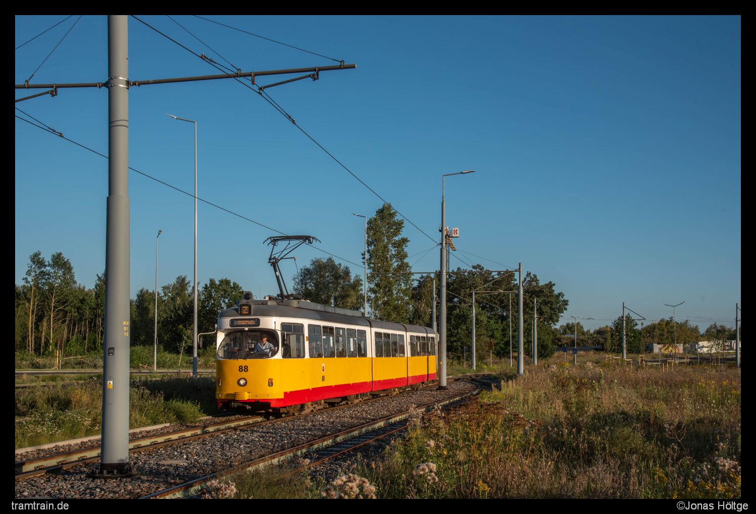 Für den darauffolgenden Wagen 88 hatte ich mich an einer anderen Stelle aufgestellt, an der jedoch bei der Ankunft des Wagens gerade eine Wolke vor die Sonne gezogen war. Daher ging ich zu Fuß bis kurz vor die Station Legionów/Szkoła weiter. Dort eröffnete sich auch am späten Nachmittag noch eine lange sonnige Stelle. Zwar stand die Sonne schon relativ niedrig und auch nicht ganz perfekt, für ein schönes Bild des Wagens reichte es aber auf jeden Fall noch aus.