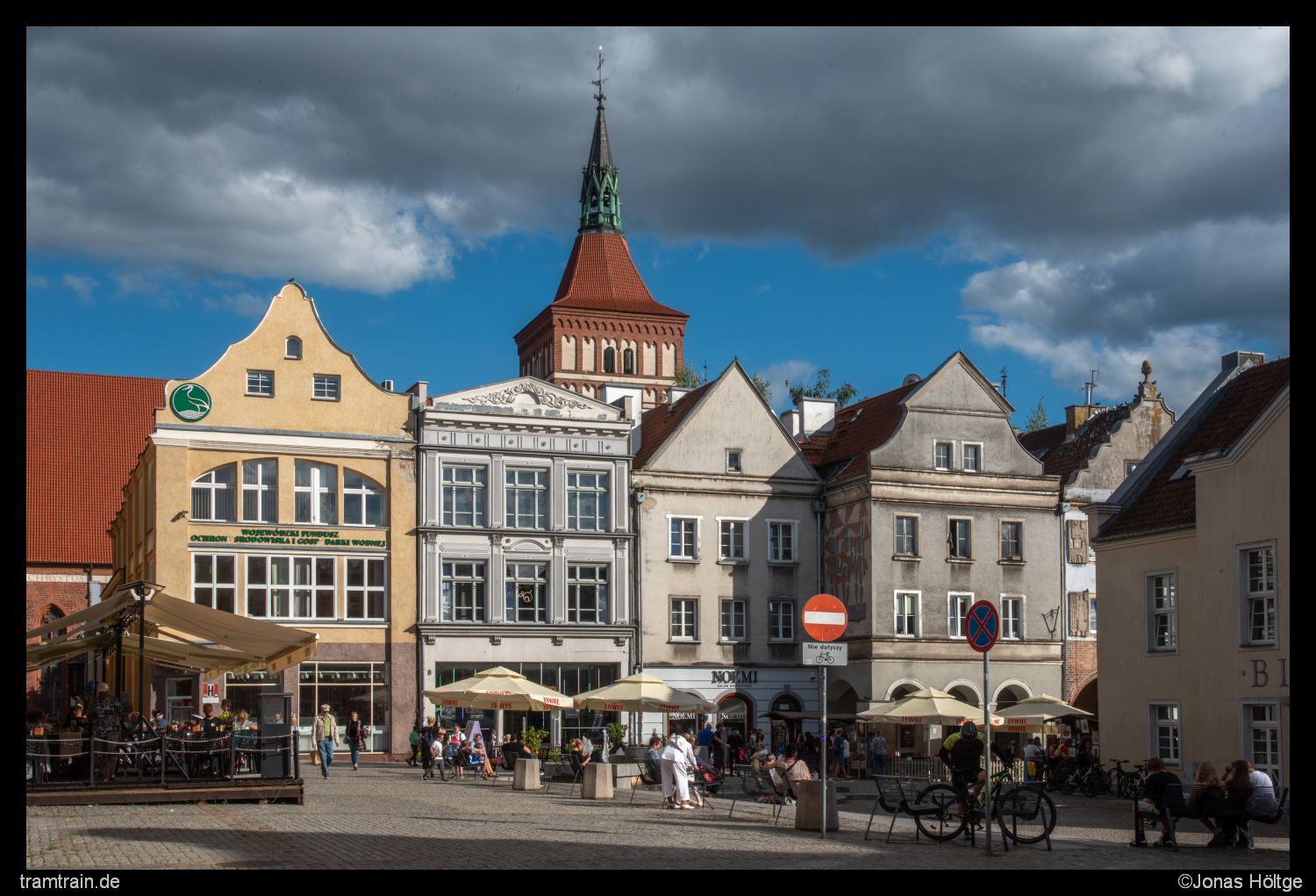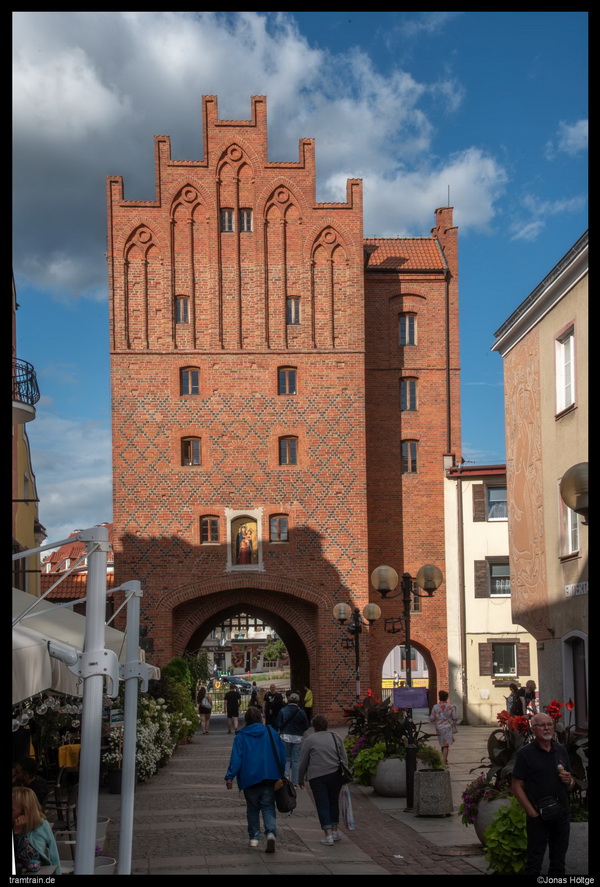 Inzwischen war es schon nach 15 Uhr und der Hunger packte mich. Zum Glück befand sich direkt an der Station Centrum ein riesiges Einkaufszentrum, bei dem ich sicherlich etwas zu Essen finden würde. Also ging ich die paar Meter zum Einkaufszentrum herunter und fand tatsächlich bei einem Becker etwas Essbares. Für polnische Verhältnisse relativ teuer zahlte sich der hohe Preis durch super Geschmack aus und ich verbrachte die nächste halbe Stunde erstmal auf einer Bank und beobachtete das geschäftige Treiben rund um das Einkaufszentrum. Auch die Bahnen zogen unermüdlich an mir vorbei, da konnte ich aber eher weniger mit etwas Spannendem rechnen, weshalb mein Fokus auf dem Essen lag. Nach der kurzen Pause war meine Motivation für eine übermäßig intensive weitere Erkundung der Straßenbahn auch eher gering. Ich setzte noch zwei Motive an dem kurzen Ast in Richtung Wysoka Brama um und fuhr kurz zu der Stelle, die ich mir vorhin an dem Ast in Richtung der Station Piłsudskiego notiert hatte. Danach begab ich mich auf eine kleine Erkundung der Altstadt von Allenstein. Wie bereits vorhin erwähnt, war der Eingang in die Altstadt nur ein paar Schritte von der Endstation Wysoka Brama entfernt. Im Durchgang durch das Eingangstor, welches in Form eines kleinen Turmes noch vorhanden war, lag sogar noch ein Stück Gleis im Kopfsteinpflaster verankert. Im Gegensatz zum neu eröffneten Regelspurnetz handelte es sich damals bei der Straßenbahn von Allenstein um ein Meterspurnetz, welches tatsächlich durch das Tor hindurchführte. Bei dem Rundgang durch die Altstadt kam ich auch an einigen Kirchen sowie am Schloss von Allenstein vorbei, welches jedoch völlig unfotogen stand. Hier und da entstand ein Bild, größtenteils ließ ich mich aber einfach ein wenig Treiben und genoss die Einflüsse, die auf mich einwirkten. Nach einer halben Stunde, die ich durch die Altstadt gegangen war, orientierte ich mich wieder zurück zur Straßenbahn.
