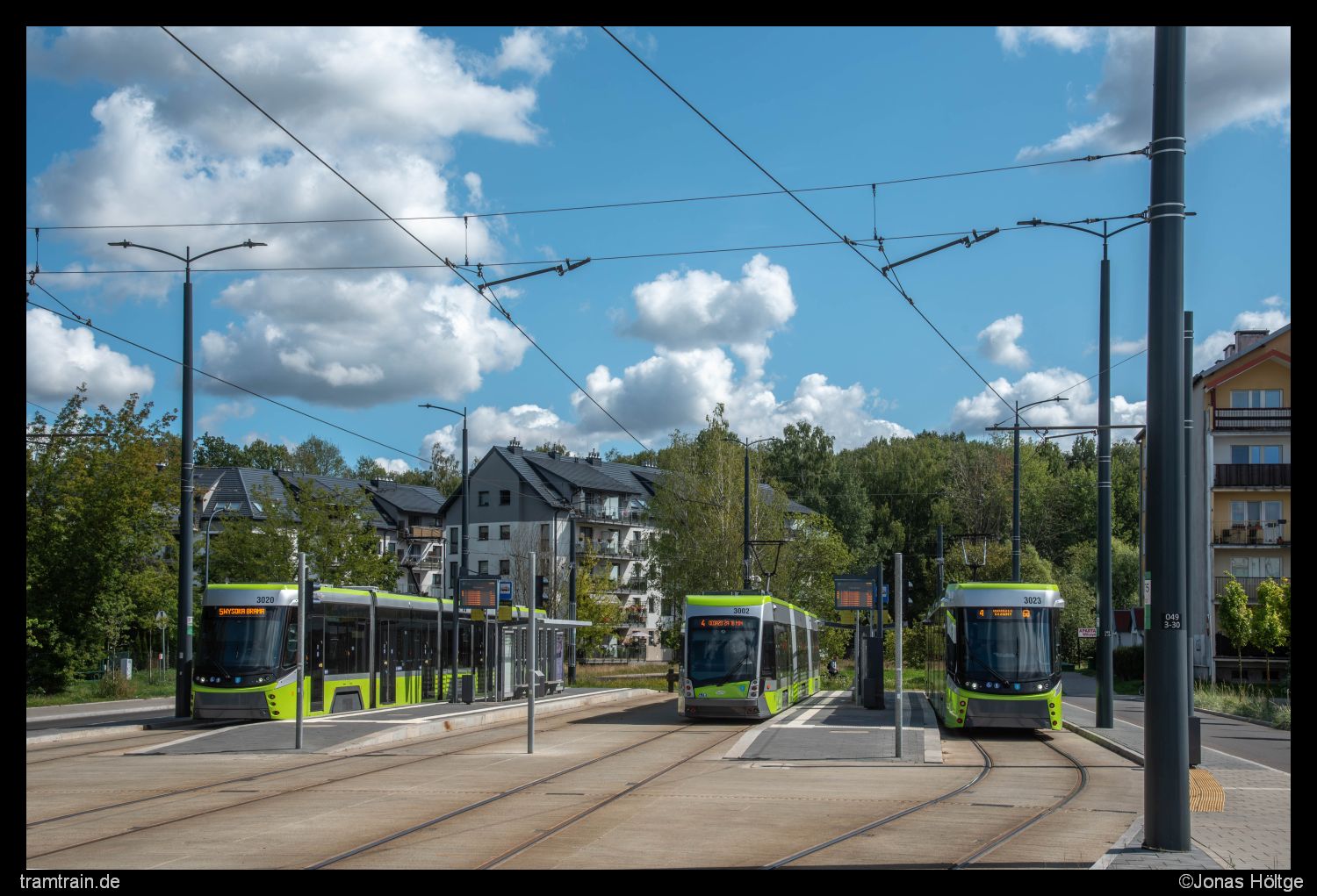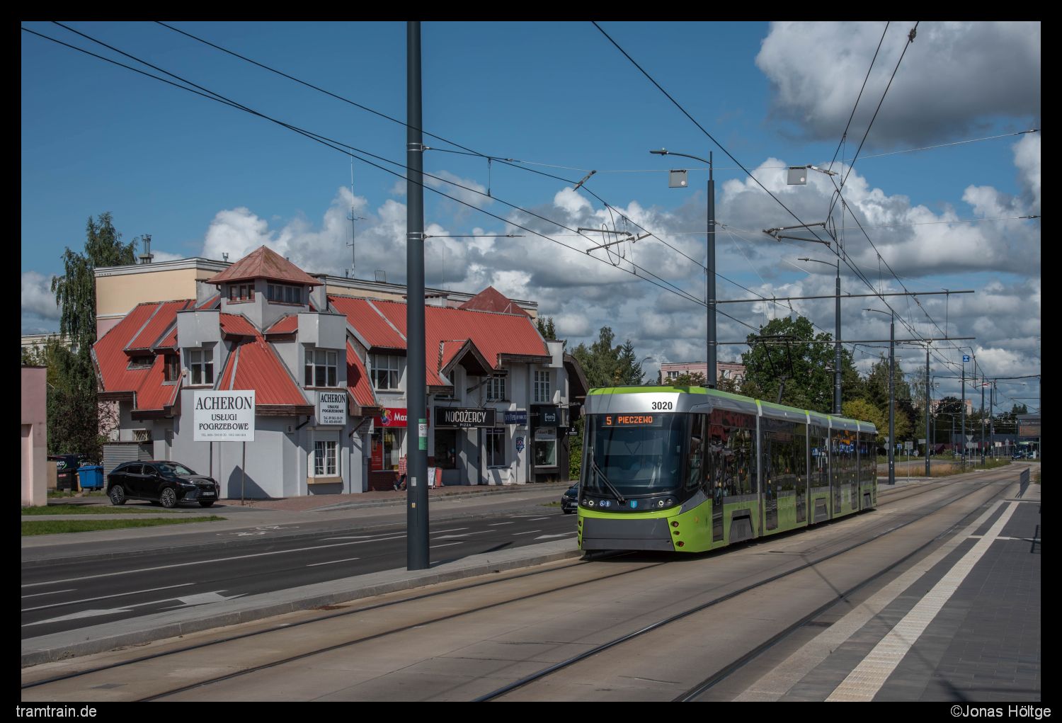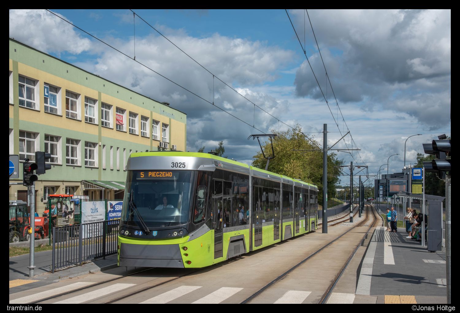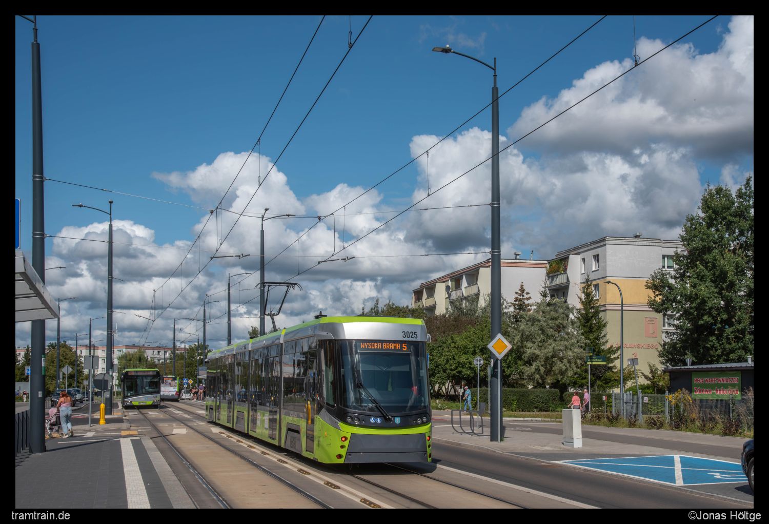 Zwischen der Station Gębika und der Endstation Pieczewo fuhren, noch deutlich häufiger als die beiden Straßenbahnlinien, jede Menge Buslinien parallel zur Straßenbahn. Dementsprechend nahm ich für den Weg zur letzten Station vor der Endstation, der gleichnamigen Station Pieczewo, den Bus. Kurz nachdem ich den Bus verlassen hatte, kam bereits Wagen 3025 von der Endstation zurückgefahren und mir gelang im Haltestellenbereich ein Nachschuss des Wagens.
