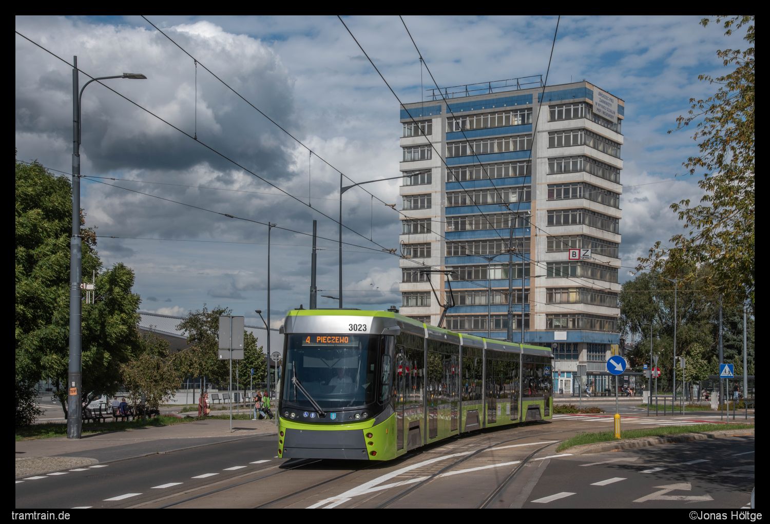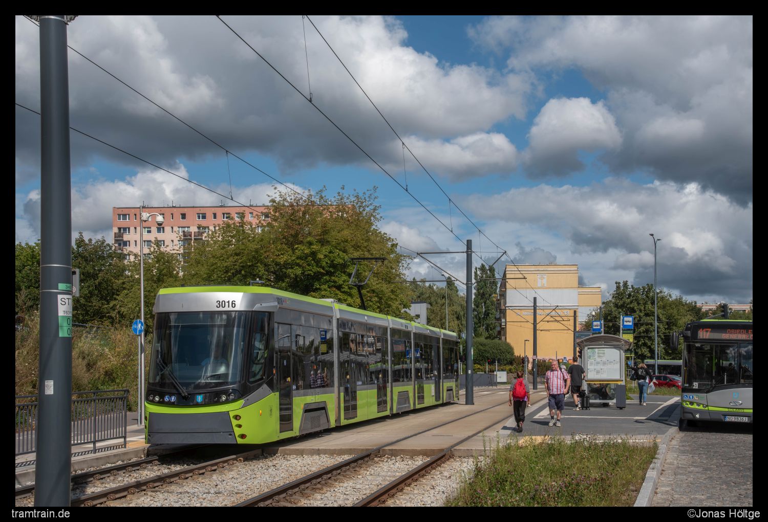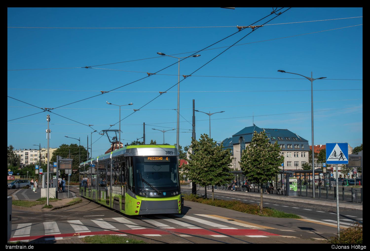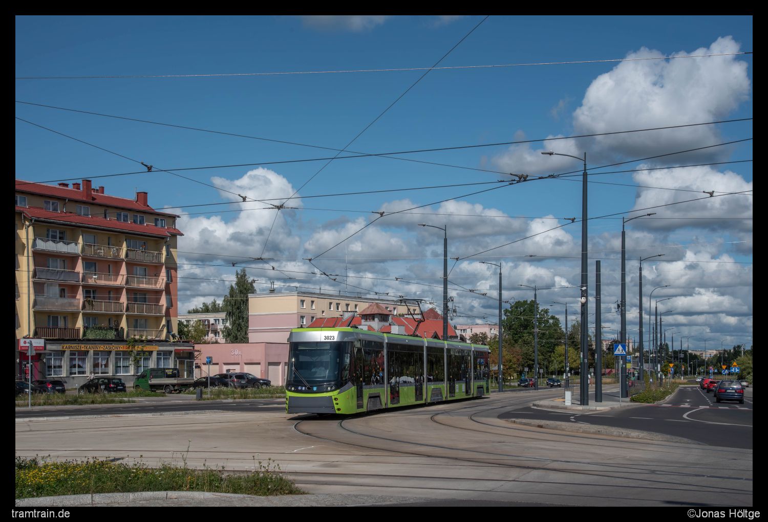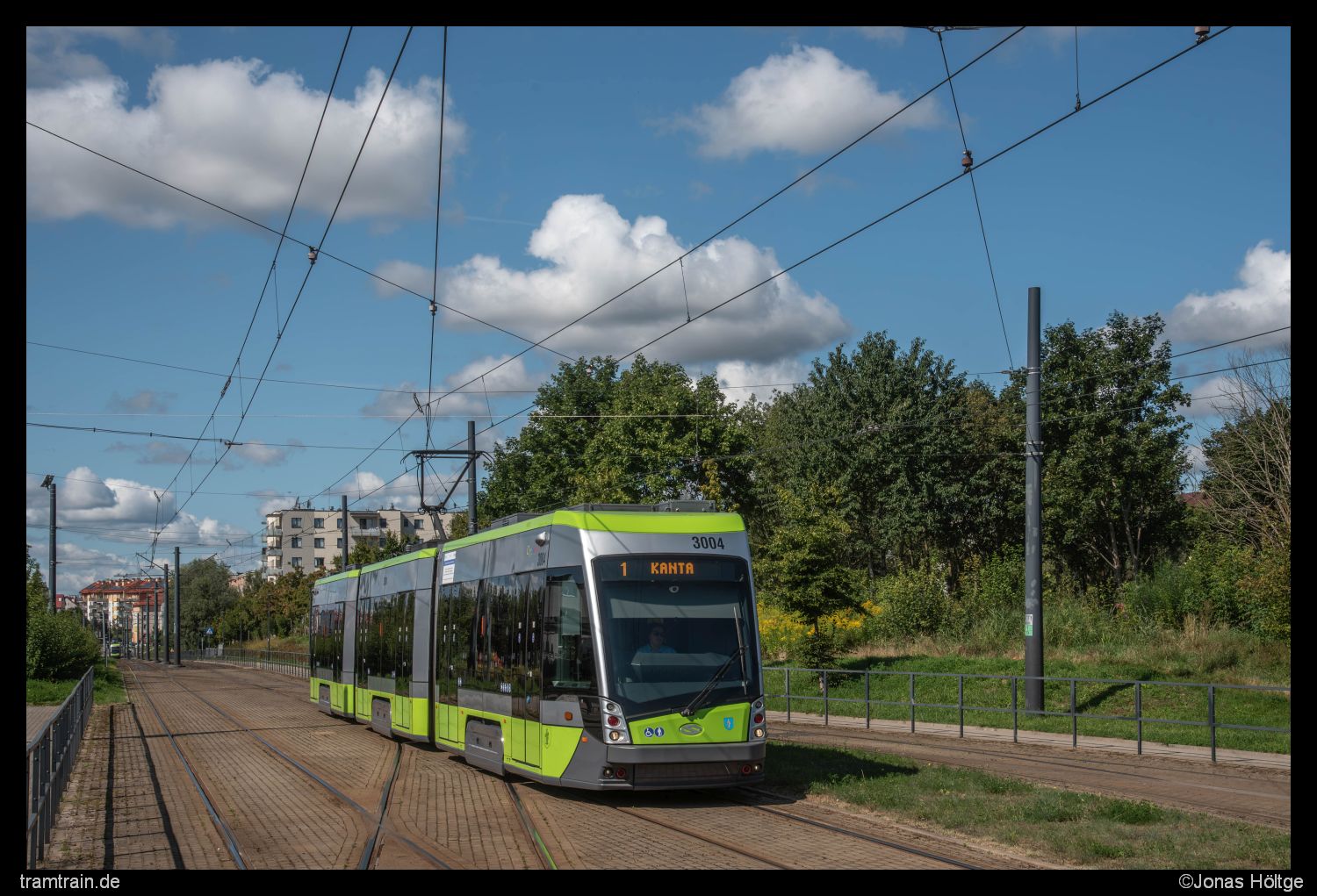 Zwischen der Station Gębika und der Endstation Pieczewo fuhren, noch deutlich häufiger als die beiden Straßenbahnlinien, jede Menge Buslinien parallel zur Straßenbahn. Dementsprechend nahm ich für den Weg zur letzten Station vor der Endstation, der gleichnamigen Station Pieczewo, den Bus. Kurz nachdem ich den Bus verlassen hatte, kam bereits Wagen 3025 von der Endstation zurückgefahren und mir gelang im Haltestellenbereich ein Nachschuss des Wagens.
